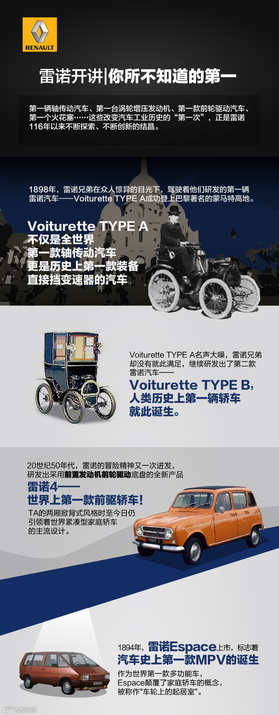 第一辆轴传动汽车、第一台涡轮增压发动机、第一款前轮驱动汽车、第一个火花塞……这些改变汽车工业历史的“第一次”,正是雷诺116年以来不断探索、不断创新的结晶!