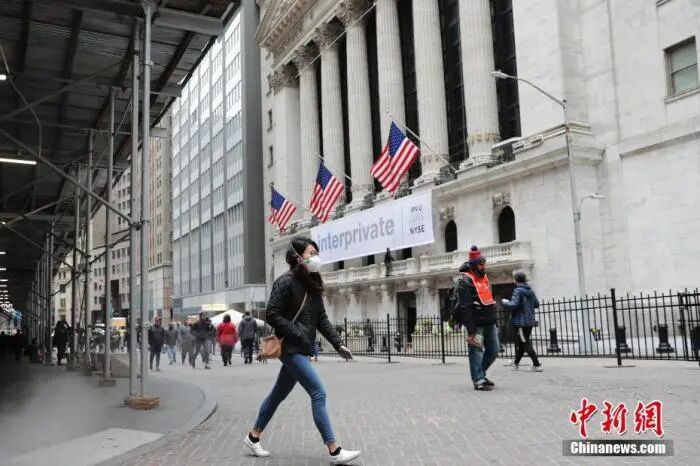 当地时间3月12日,一位戴口罩的民众走过纽约证券交易所。中新社记者 廖攀 摄