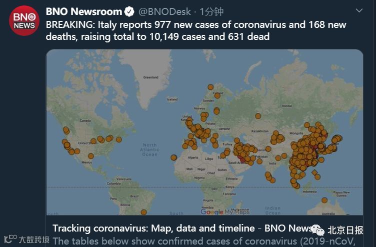 博雷利在当晚的新闻发布会上说,意大利新冠肺炎确诊病例较上一日增加977例,当天新增死亡病例168例,累计死亡631例,累计治愈1004例。