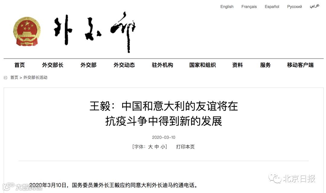 王毅还表示,在共同抗疫的斗争中,两国关系将得到进一步深化,两国人民的友谊将得到进一步升华。感谢意方高度重视旅意中国公民的健康和安全,希望意方继续向他们提供必要支持和协助。我们一定能够携手最终战胜疫情!