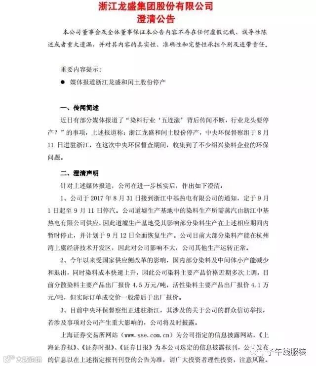 “原来传闻不是空穴来风啊。”看到浙江龙盛今日澄清公告,业内人士对e公司感慨,两大龙头停产传闻, 只是夸大了事实。但是,这种有一定事实依据的传闻,顺应了太多利益方的需求。