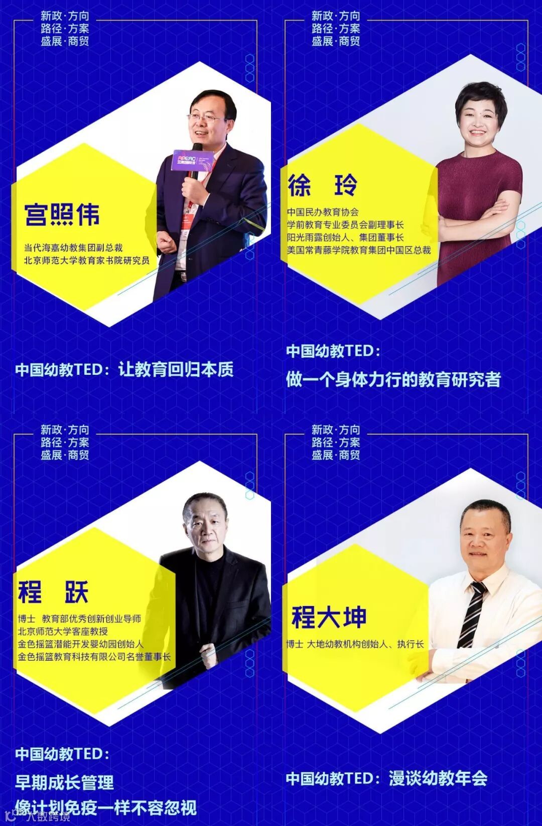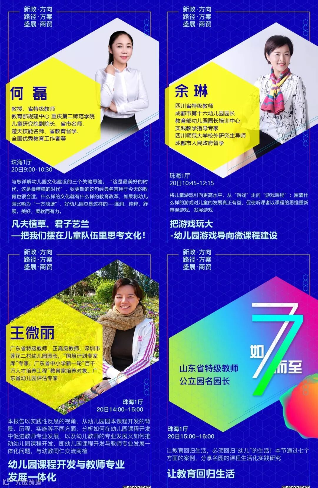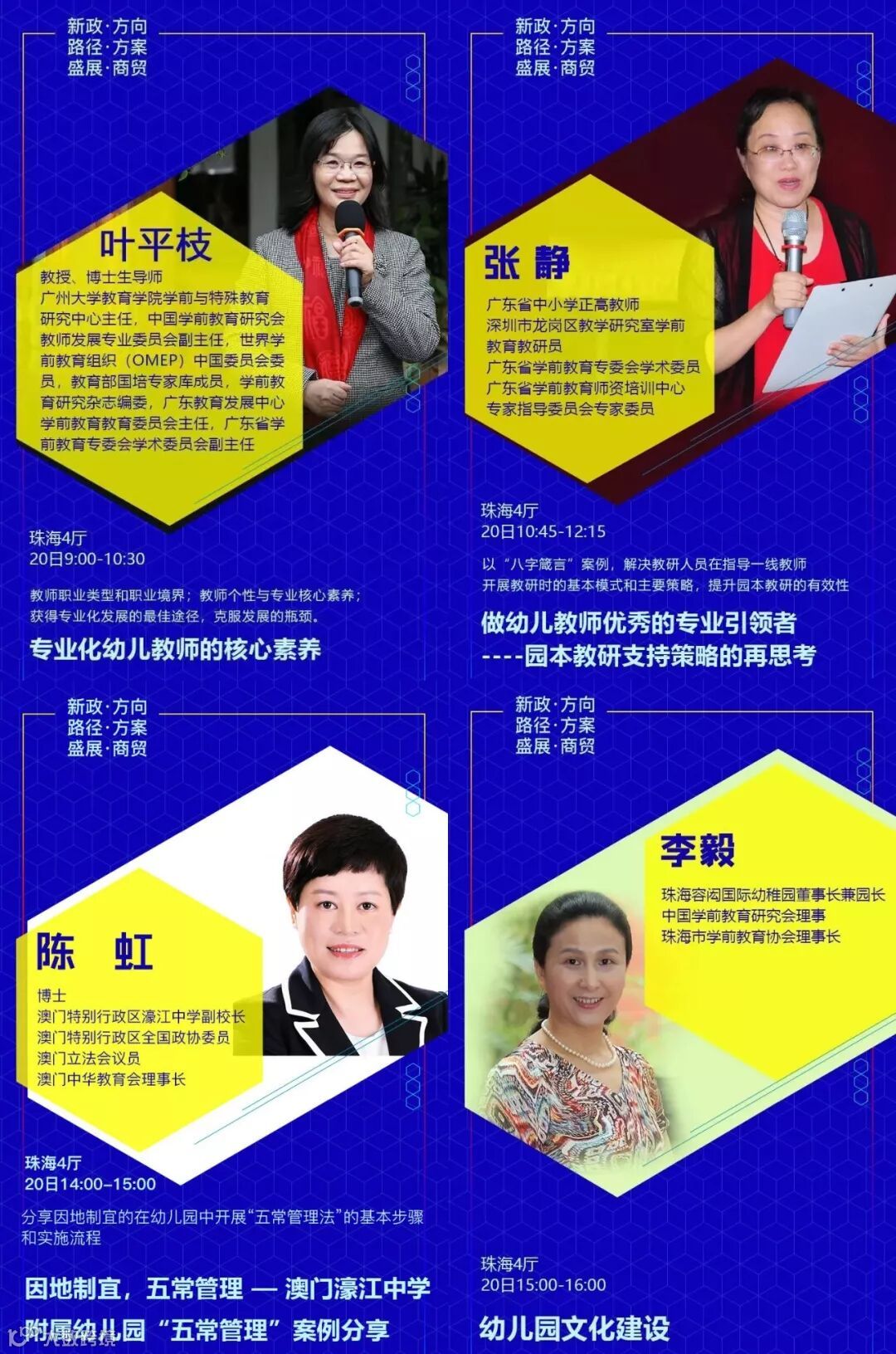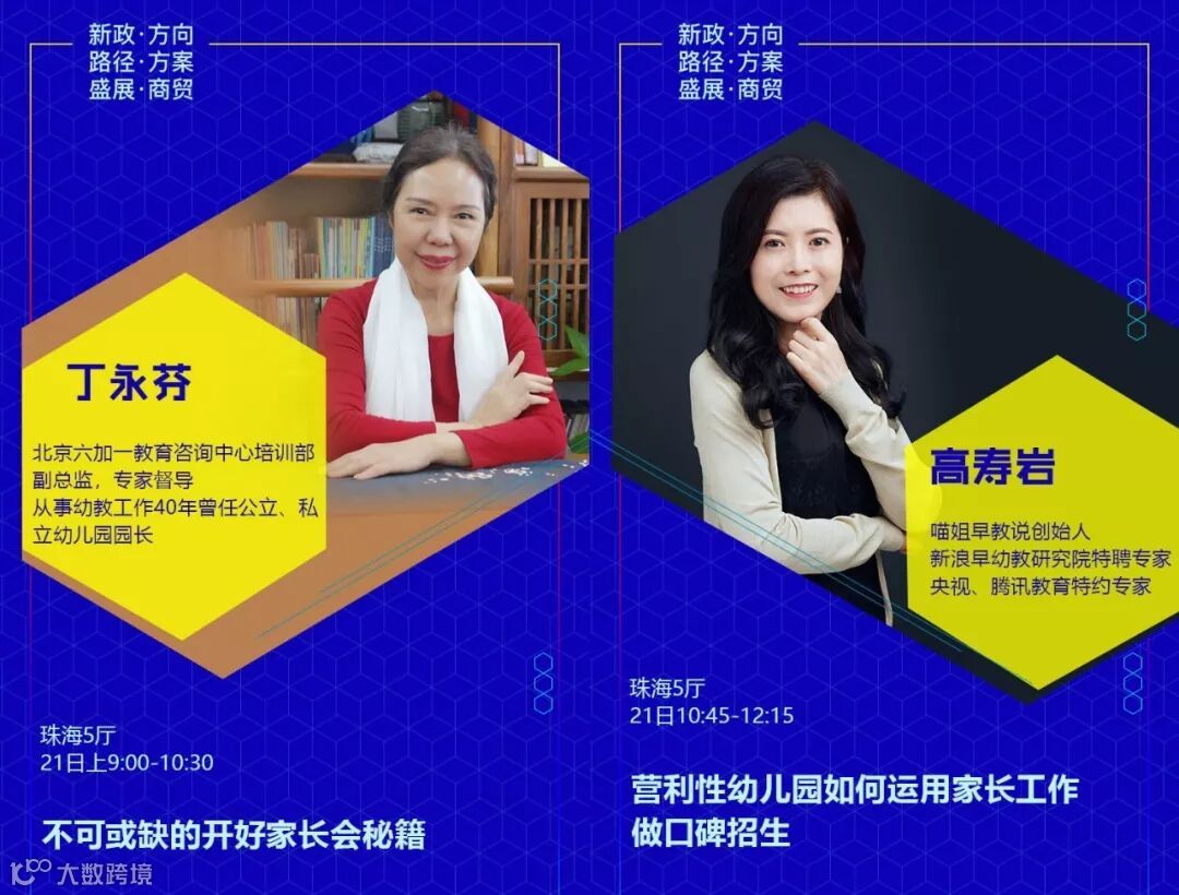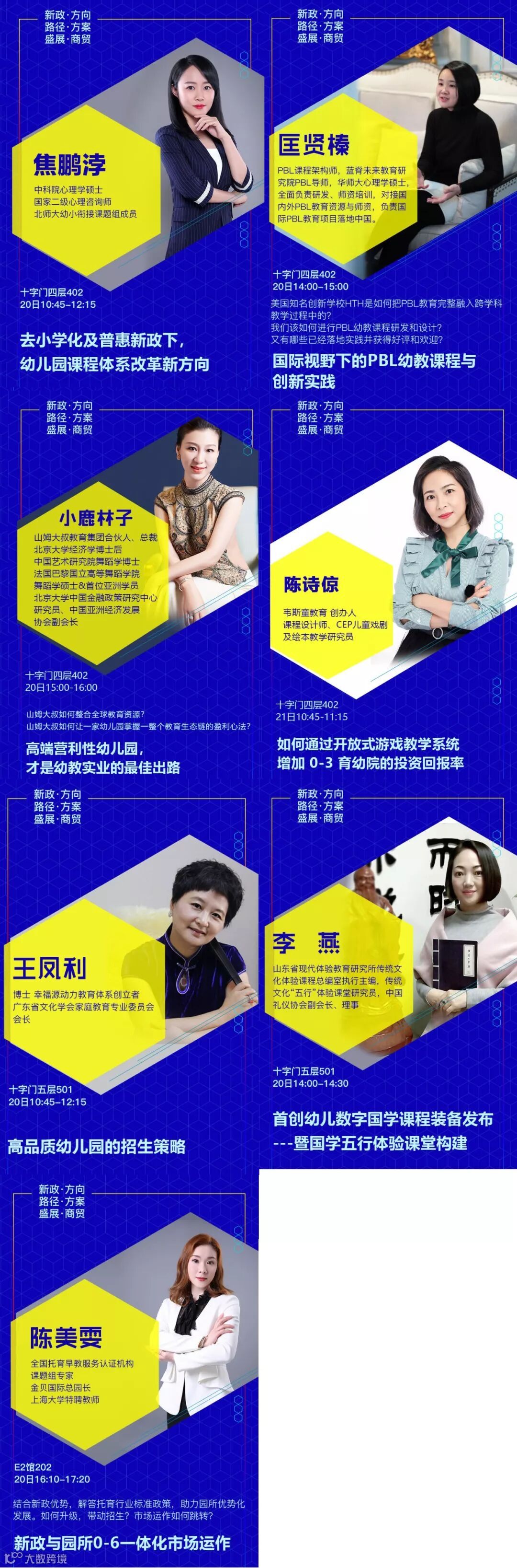 设置专题有:《新政下幼儿园的发展走向和应对措施》√《新法规与普惠园转型发展》√《新法规与营利园转型发展》√《教科研专题》√ 《名园长管理专题》√《保健安全后勤》√ 《教师专业成长》√《游戏课程建设》√ 《产业/资本专题》√《国际幼教论坛》√ 《托育、0~6一体化》√《粤港澳大湾区幼教》√ 《家园关系》√《中国幼教名园长TED论坛:核心理念与文化思考》√《中国幼教领军人TED论坛: 教育思考和前瞻未来模式》√《特色幼教工作坊》企业专场√