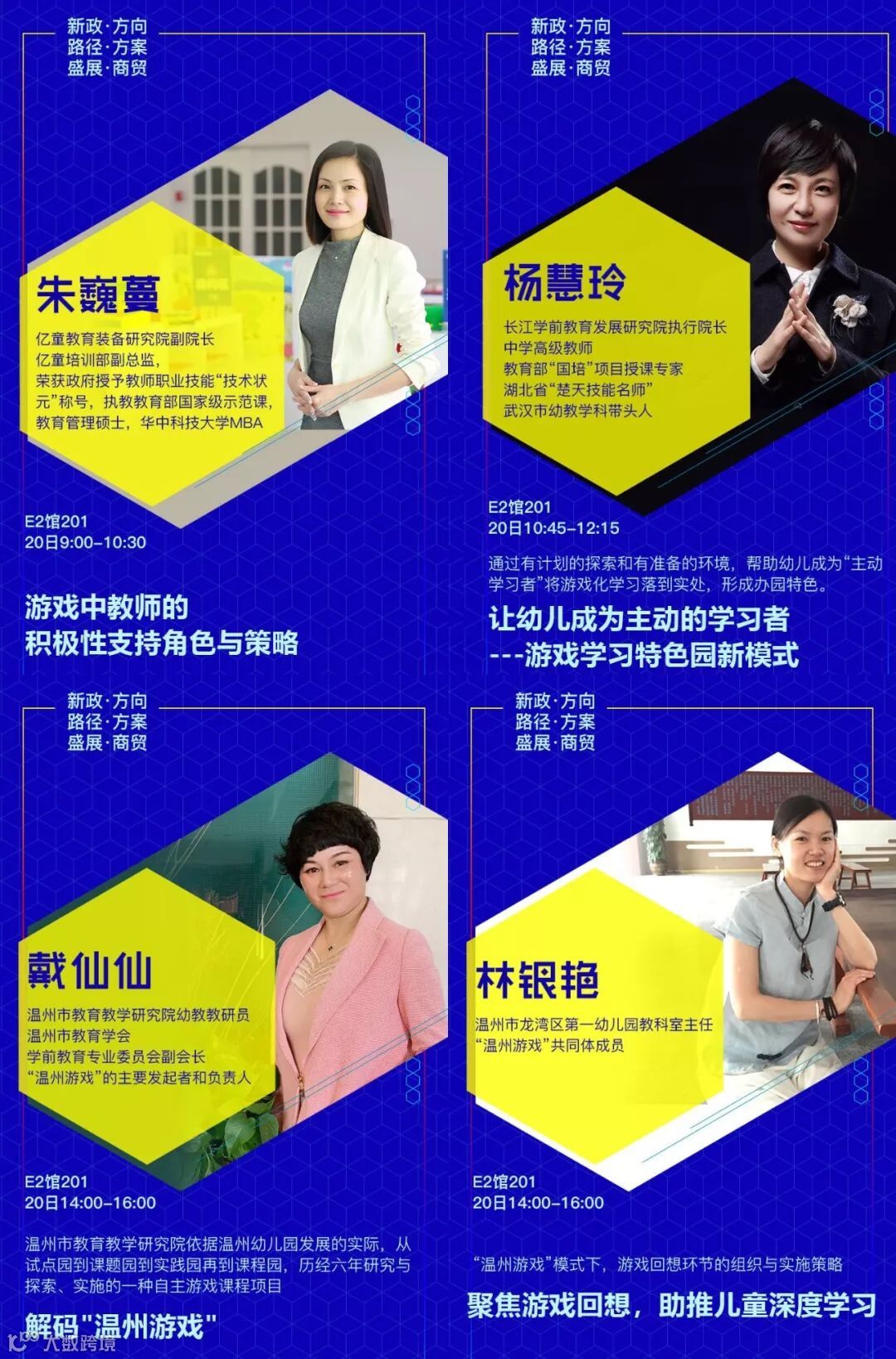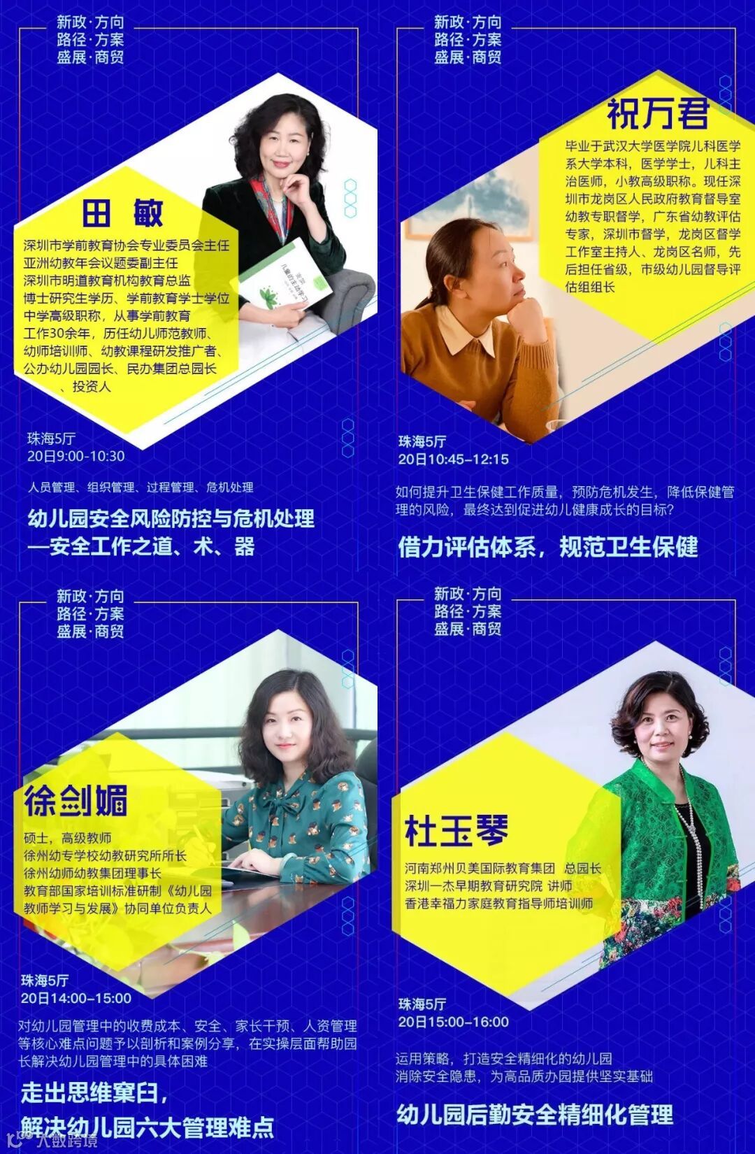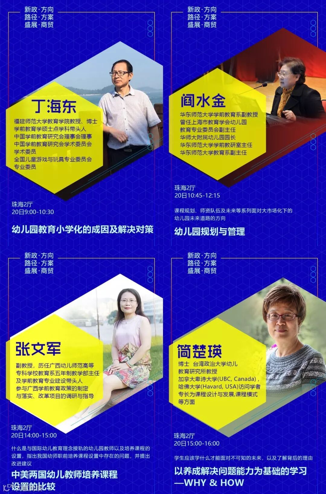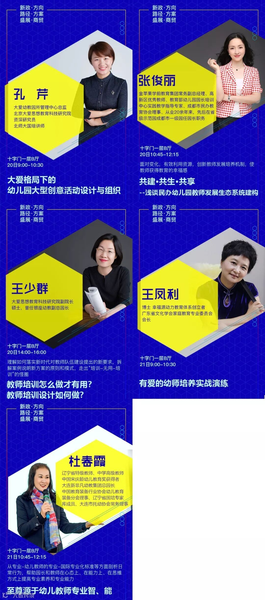 设置专题有:《新政下幼儿园的发展走向和应对措施》√《新法规与普惠园转型发展》√《新法规与营利园转型发展》√《教科研专题》√ 《名园长管理专题》√《保健安全后勤》√ 《教师专业成长》√《游戏课程建设》√ 《产业/资本专题》√《国际幼教论坛》√ 《托育、0~6一体化》√《粤港澳大湾区幼教》√ 《家园关系》√《中国幼教名园长TED论坛:核心理念与文化思考》√《中国幼教领军人TED论坛: 教育思考和前瞻未来模式》√《特色幼教工作坊》企业专场√