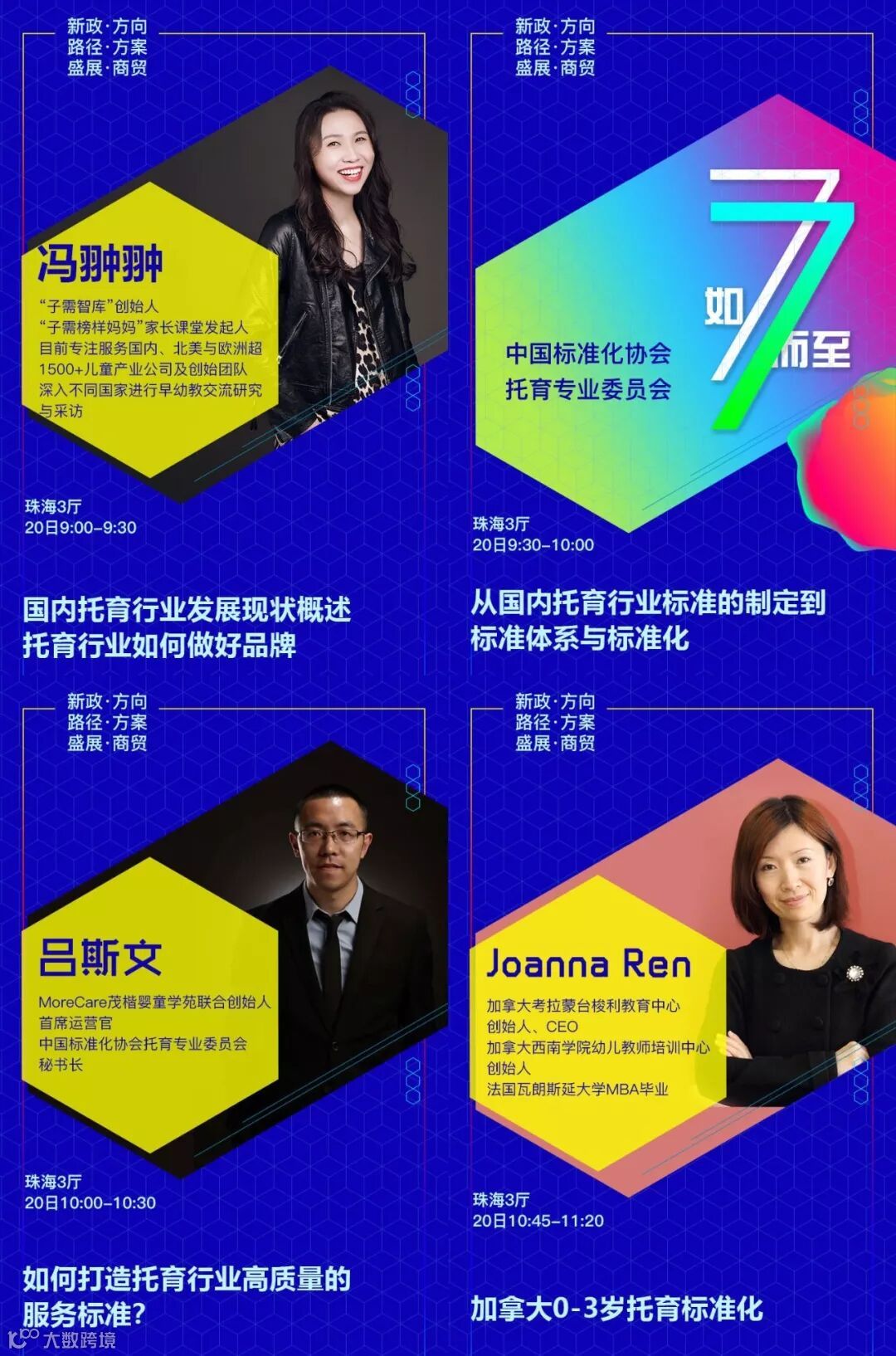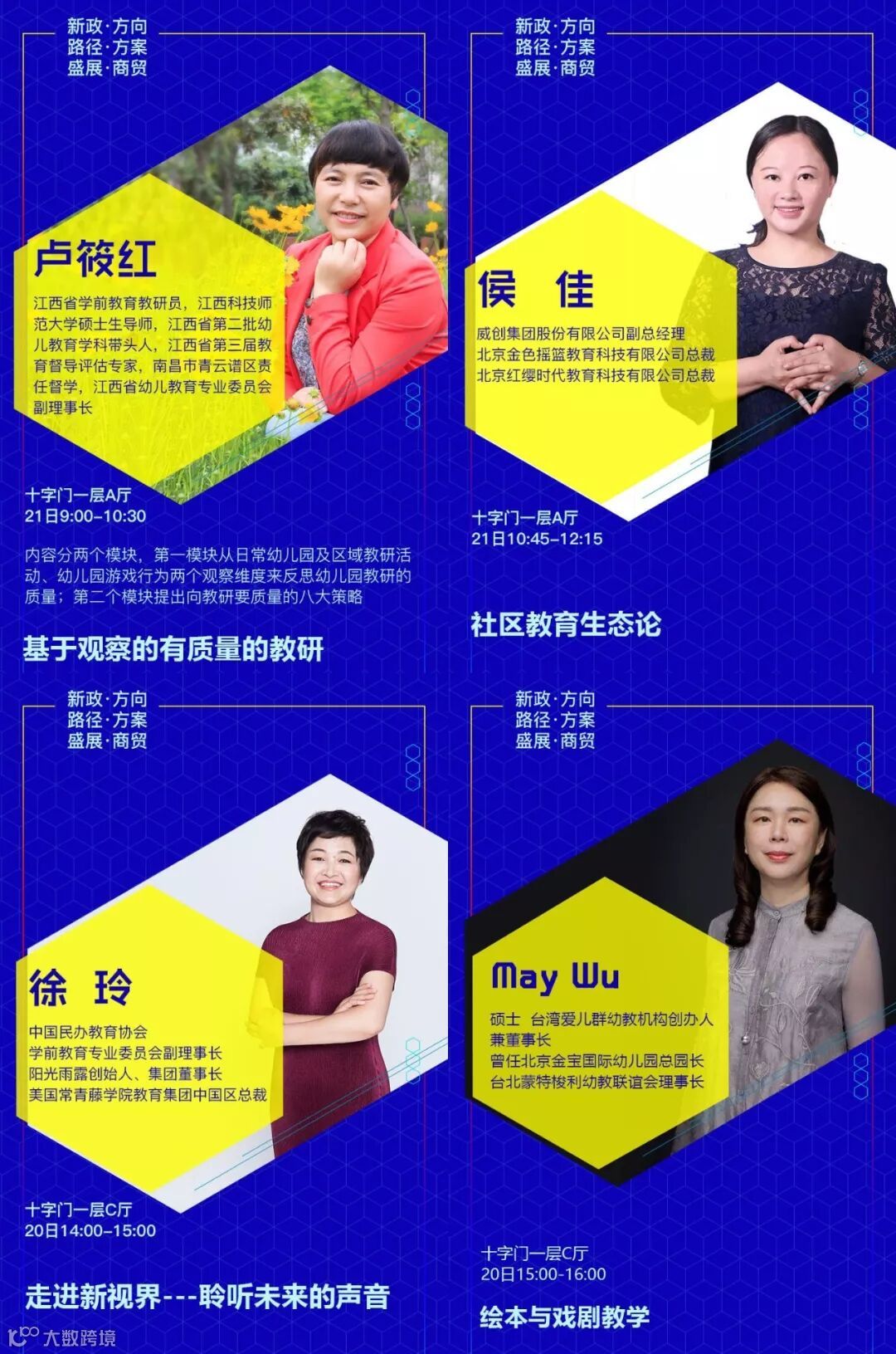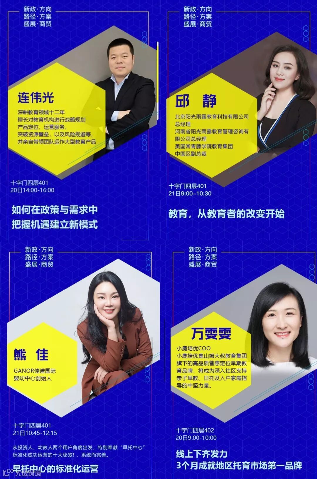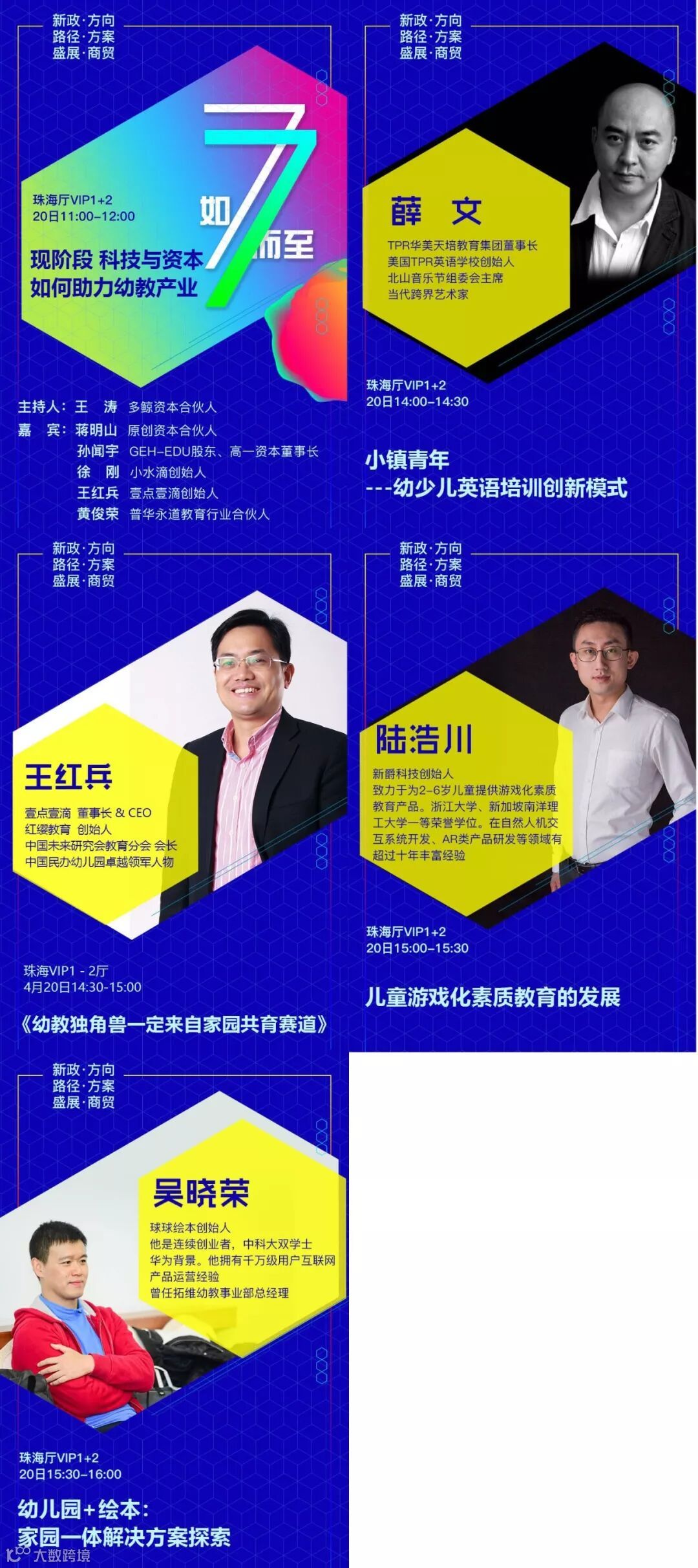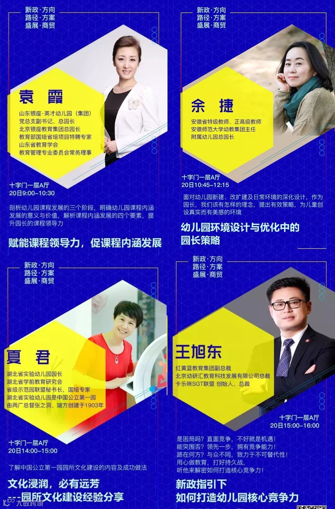 设置专题有:《新政下幼儿园的发展走向和应对措施》√《新法规与普惠园转型发展》√《新法规与营利园转型发展》√《教科研专题》√ 《名园长管理专题》√《保健安全后勤》√ 《教师专业成长》√《游戏课程建设》√ 《产业/资本专题》√《国际幼教论坛》√ 《托育、0~6一体化》√《粤港澳大湾区幼教》√ 《家园关系》√《中国幼教名园长TED论坛:核心理念与文化思考》√《中国幼教领军人TED论坛: 教育思考和前瞻未来模式》√《特色幼教工作坊》企业专场√
