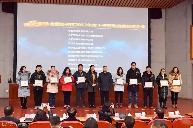 本届年会的主题是“新时代人力资源的协同、创新、发展”,年会由工作报告、信息发布、表彰、论坛等不同环节组成。会中进行表彰,安徽佳通轮胎有限公司被授予合肥市经济技术开发区“2017年度十佳劳动关系和谐企业”荣誉称号。