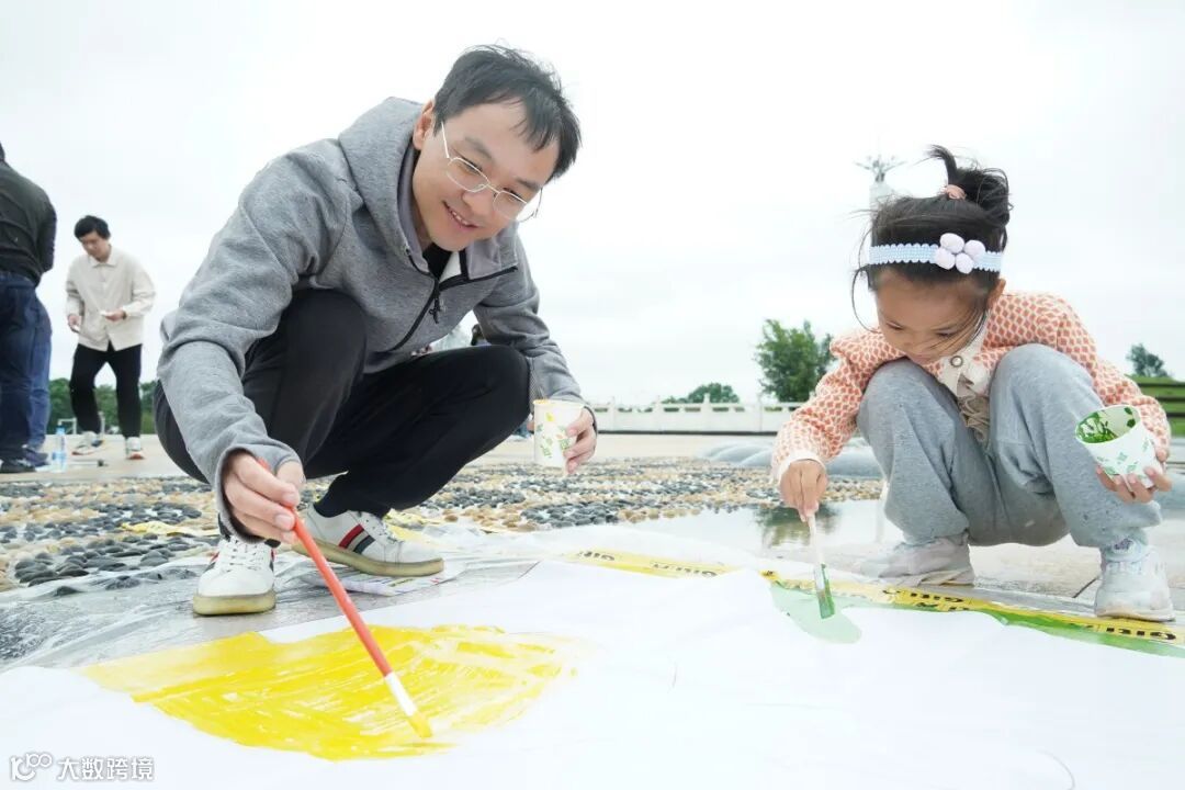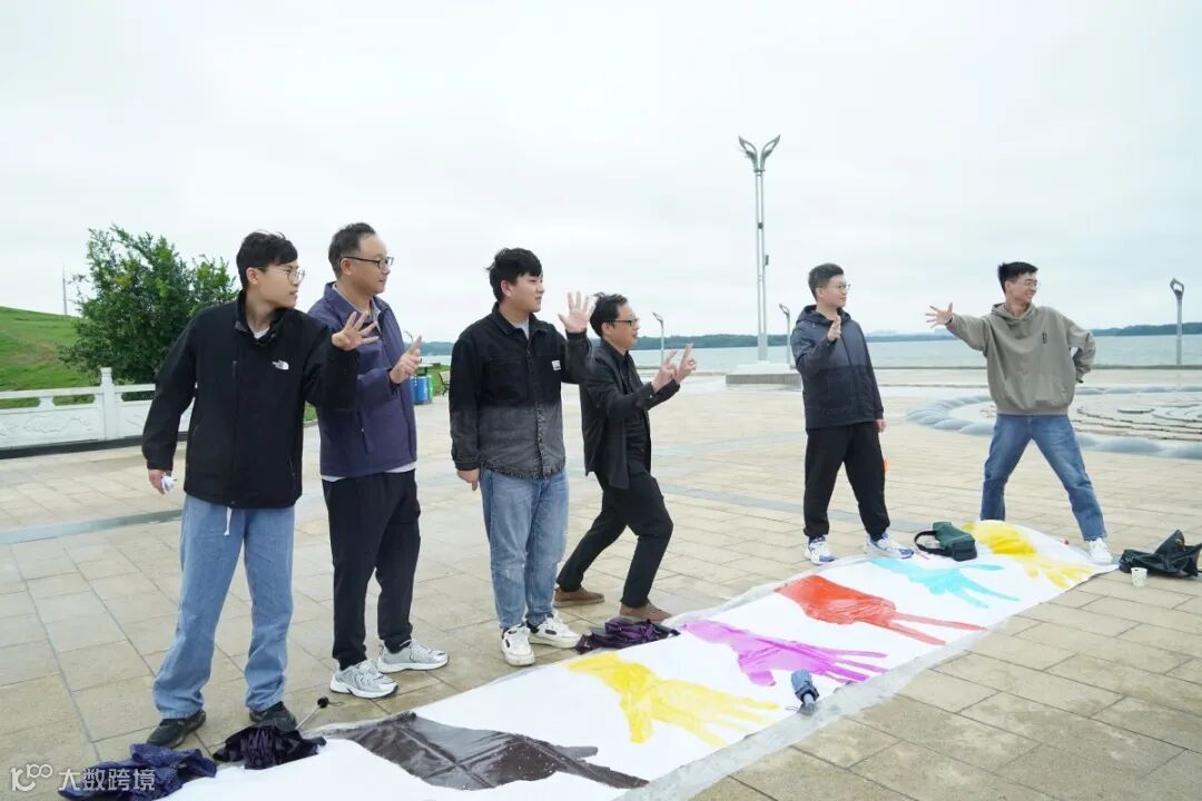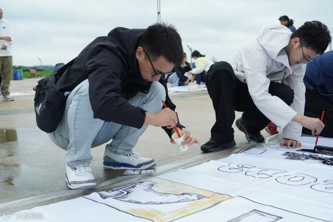 当天细雨蒙蒙,地面湿滑,湖边风很大,各小组分工协作,有人负责找干场地,有人负责找避风点,有人负责固定画布,有人负责取颜料,有人负责描绘。