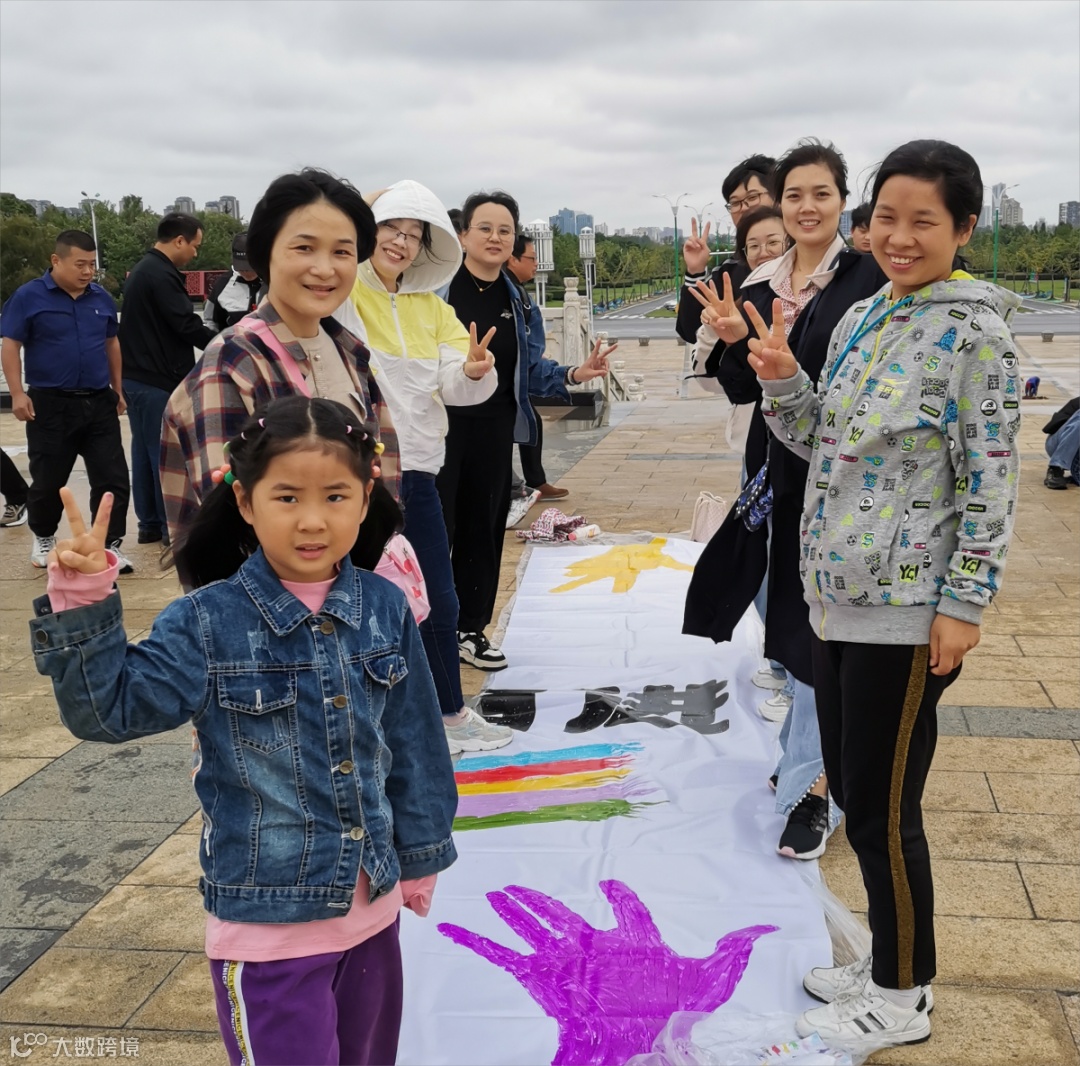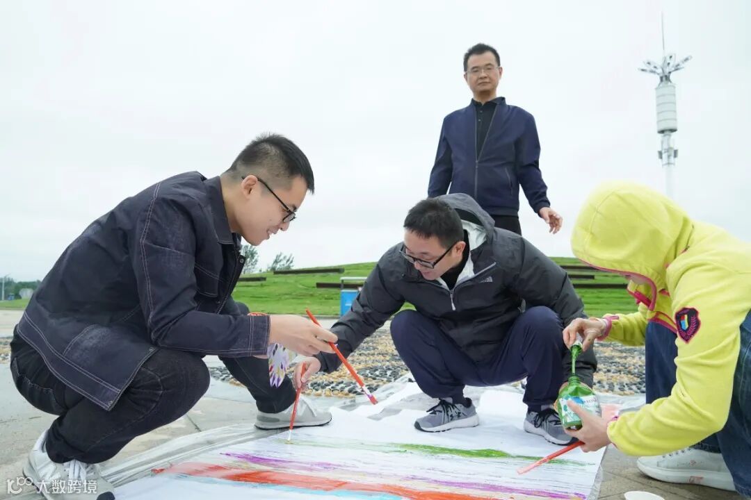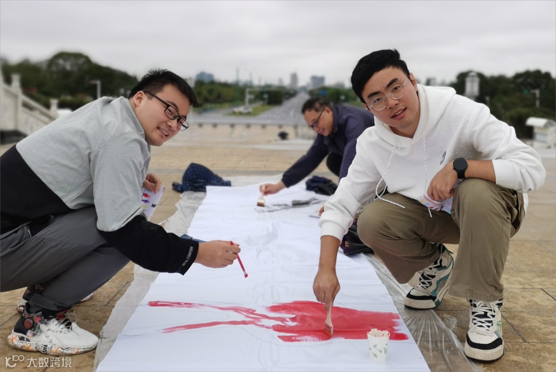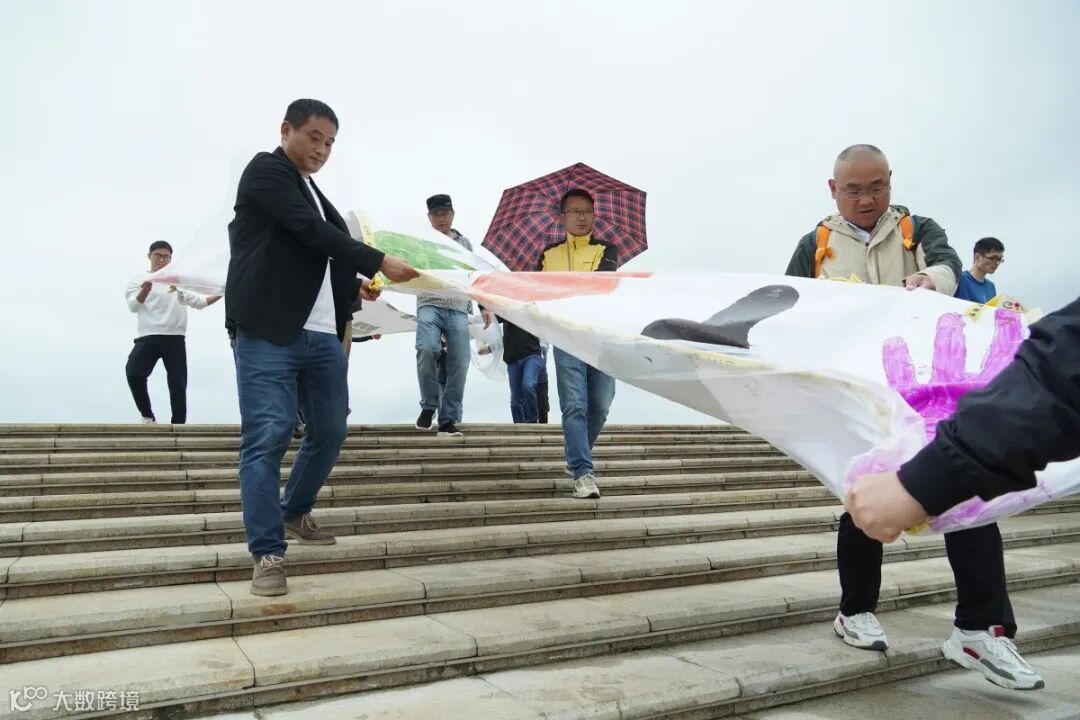 观景台上风越来越大,各小组转移画作的时候,大家各显神通,齐心协力稳住画布,匀速将画布转移至观景台下的广场上。