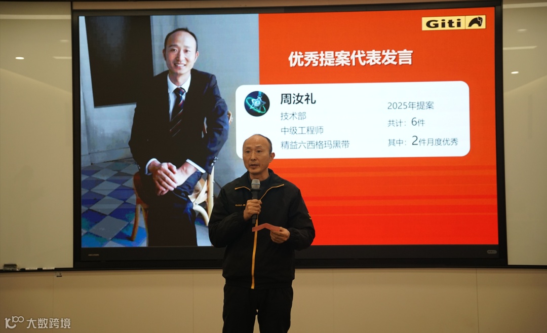 技术部周汝礼作为优秀提案代表在会上发言,分享改善心得。周汝礼作为中级工程师、精益六西格玛黑带获得者,2025年共提交提案6件,其中2件获评月度优秀。