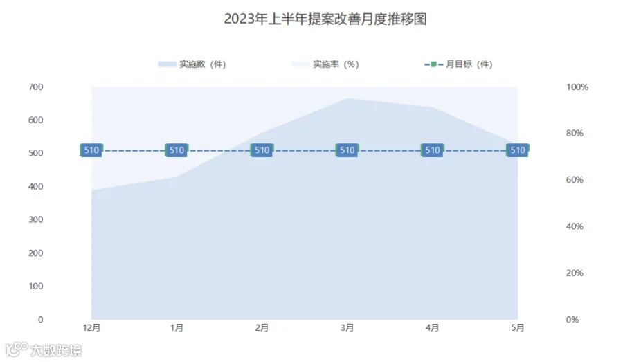 2023年上半年公司各部门共提交提案3213件,年度目标达成率53%(指标6116件),3213件提案全部实施,提案实施率100%。