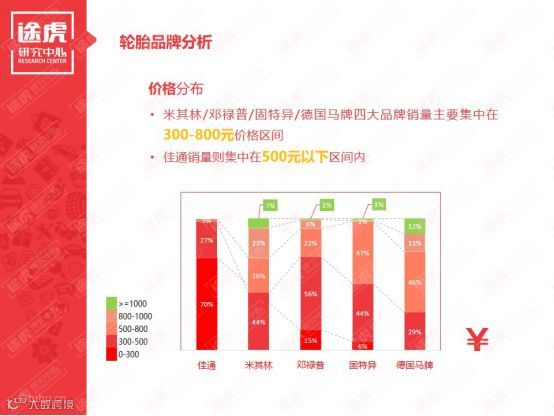 从轮胎价格区间来看,4月份轮胎消费集中在300-800元价格区间的市场。米其林、邓禄普、固特异、德国马牌四大品牌销量主要集中在300-800元价格区间,而佳通销量则是集中在500以下的价格区间。各轮胎规格价格分布差异不大,最热销的205/55 R16规格销量集中在300-500元价格区间。但在轮胎花纹方面,各轮胎品牌价格分布差异较大,最热销的ST浩悦花纹价格集中在500-800元价格区间,佳通228花纹价格则集中在300元以下价格区间。在五大热销区域比较突出的是1000元以上价位的中高端轮胎销量有明显的提高,并且整体价格区间上的轮胎销量分布较为一致。