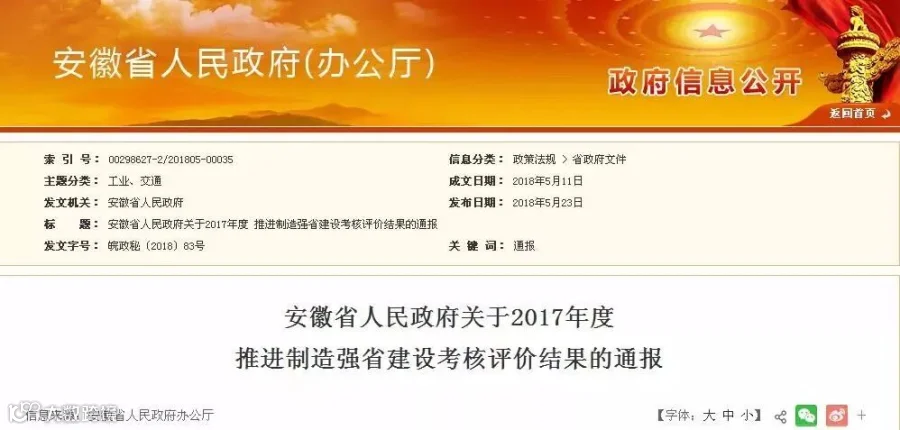 日前,安徽省人民政府发布关于《2017年度推进制造强省建设考核评价结果的通报》。通报指出,经考核认定,肥西县等为全省制造业发展综合10强县(市)、合肥市蜀山区等为制造业发展综合10强区,界首市等为制造业发展增速10快县(市)、马鞍山市花山区等为制造业发展增速10快区,安徽佳通乘用子午线有限公司等为制造业综合实力50强企业、彭寿杨安国等为制造业50名优秀企业家。