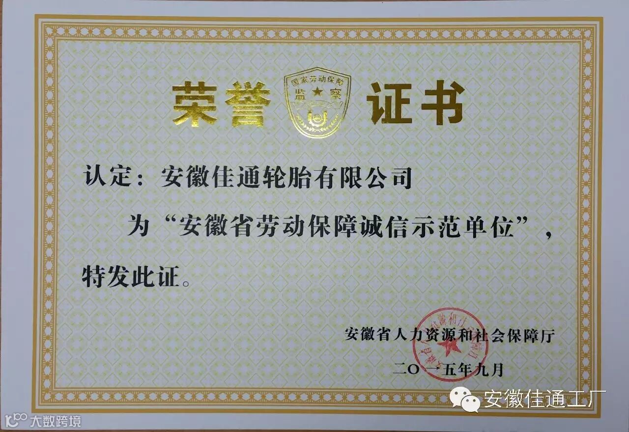 2015年下半年,在安徽省人力资源和社会保障厅组织的2015年度劳动保障年度审查会议上,安徽佳通顺利通过审查并被授予“安徽省劳动保障诚信示范单位”称号。