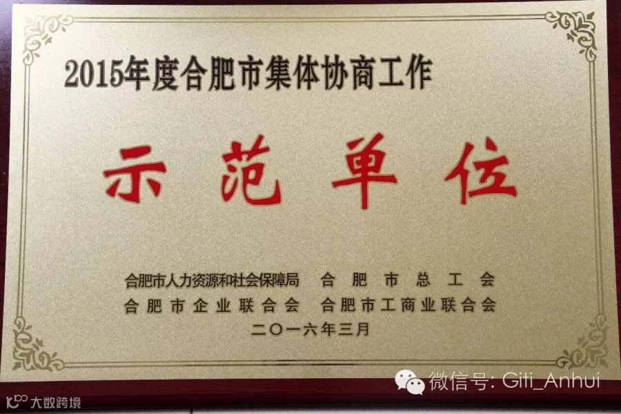 2015年5月,合肥市总工会、合肥市人力资源和社会保障局、合肥市企业联合会等单位联合对合肥市25家集体协商工作先进单位进行了通报表彰,我司荣获合肥市“2015年度集体协商工作先进单位”称号,这是对我司积极开展民主管理、构建和谐劳动关系的肯定。