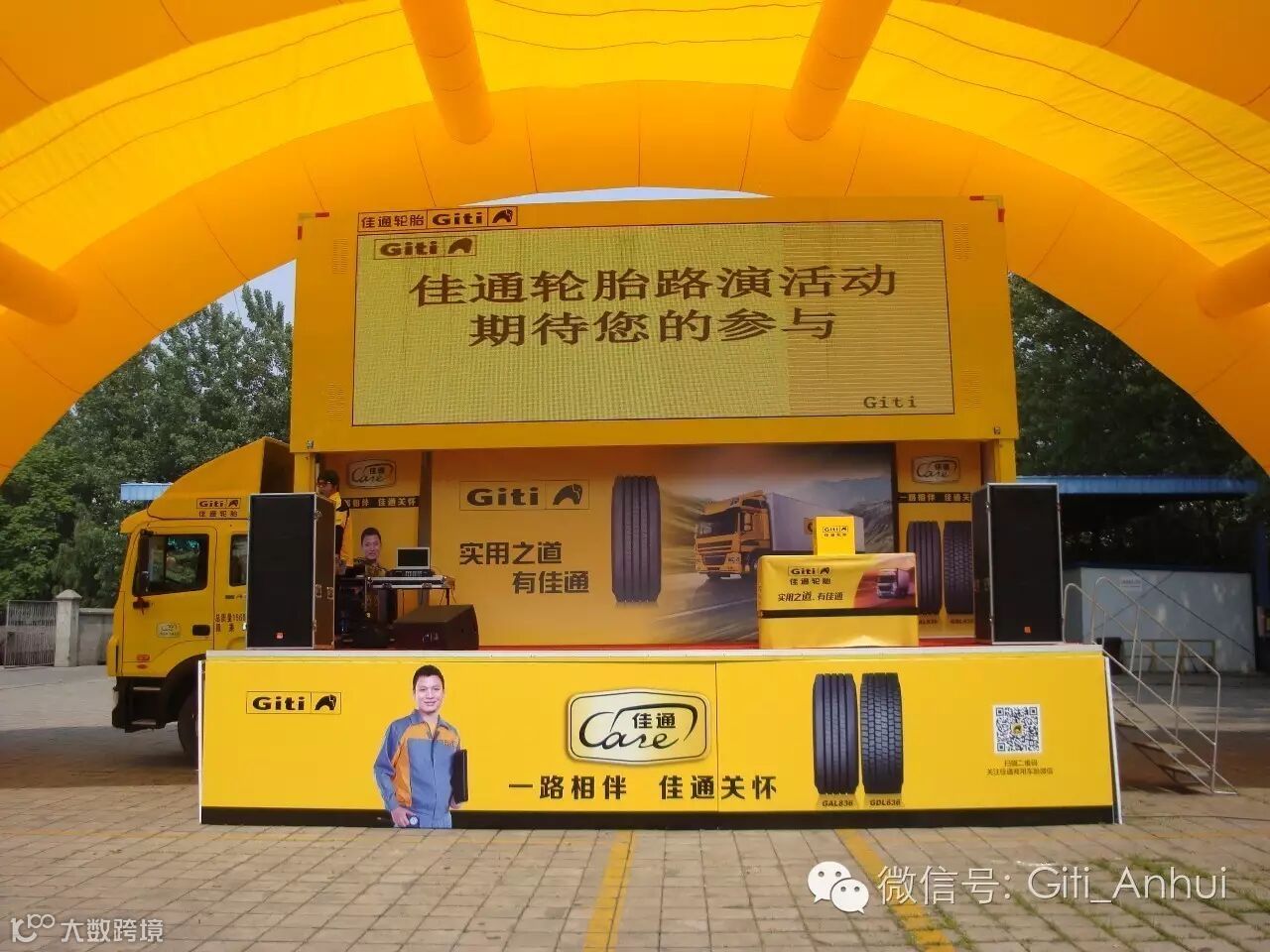 原有路演宣传车是江淮厢式货车改装而成,人工组装、搭建舞台,舞台面积狭小,视频播放采用电视机作为视频载体,已跟不上品牌宣传需要,且每次产品宣传时,搬运设备、搭建舞台、布置展架等费时费力,效率不高。新购路演宣传车车长10米,高3.9米,高端气派。车身主色调为佳通黄,张贴着公司LOGO,流光溢彩。该车左侧13平方米LED彩色显示屏,举升高度2.1米,右侧配有0.5米滚动彩屏,随时随地播放滚动字幕。该车自动化程度高,操作简单:车身液压平衡、舞台收展、屏幕举升等功能均由一个遥控器控制,真正做到一“器”在手,轻松实现舞台搭建等各项准备动作只需10分钟。同时,车厢内自带一台15千瓦欧玛超静音柴油发电机,无需外接电源,可以做到全天候、全区域的宣传活动。车辆展开后,宽大的舞台,红色的地毯,劲爆十足的音响,处处洋溢着“高大上”的氛围,彰显着佳通品牌的实力与自信。