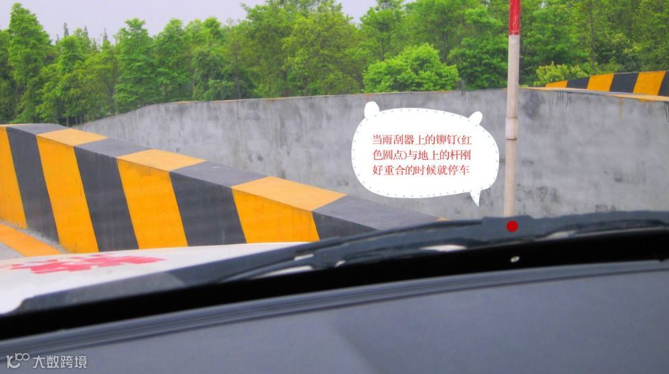 如果雨刮右侧的喷水器和路面的物体重合了,就说明车身右侧与物体之间有60cm的距离。