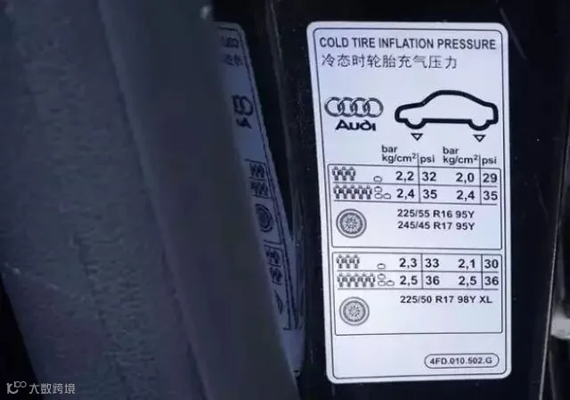 自己车的标准胎压值在哪里看?一般标签会贴在驾驶室的B柱上,打开车门就可以见到。也有些车贴在油箱盖内侧。