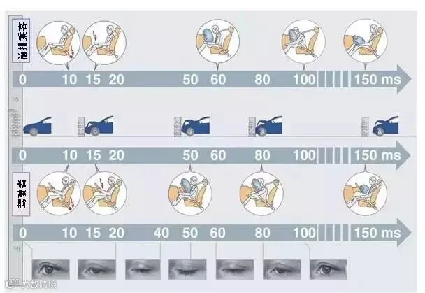 通过上面的示意图,大家能很明显的看到,当汽车刚碰撞时,这个过程前前后后不过是一眨眼的功夫,如果前段没有安全带的保护,那结果可能是在10—20ms时,司机乘客撞到方向盘或者仪表台上,之后50—60ms被时速300的安全气囊弹开,或是在气囊炸开的过程中与气囊相撞,这样的后果实在不堪设想。