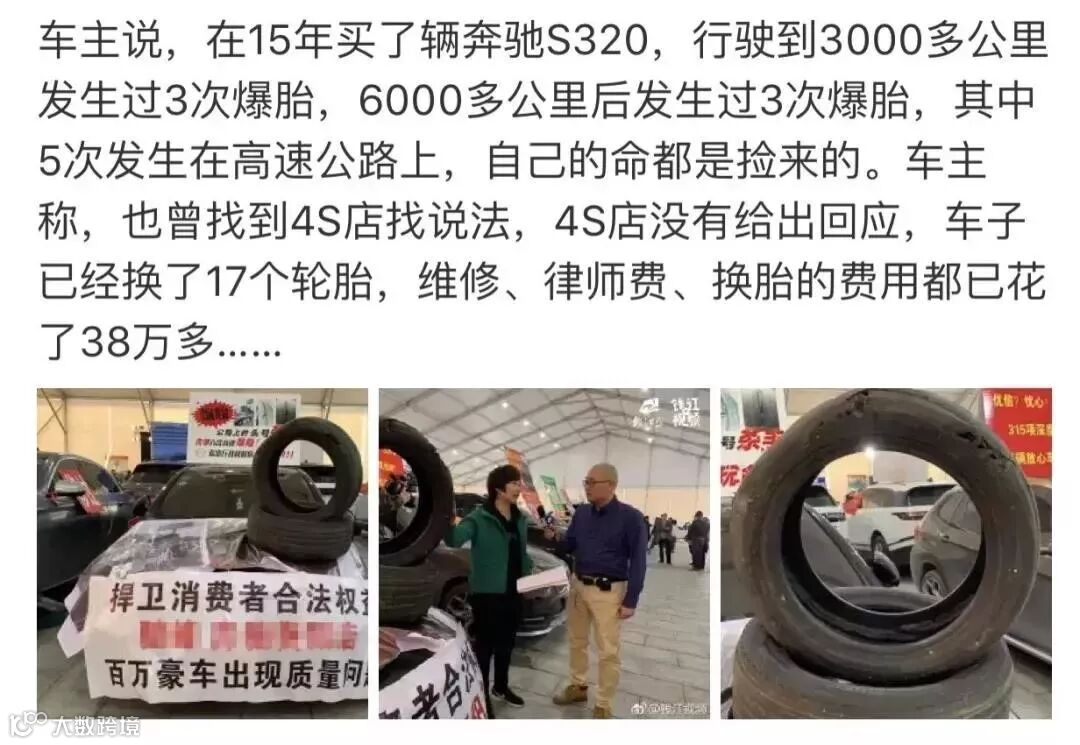 开车在外最怕遇到什么故障?这个问题一提出来,许多人第一个想到的就是“爆胎”。前不久,在某地问题车展上看到了一条让人“捉摸不透”的新闻。有一台奔驰S320车主在短短4年时间里爆胎足足出现了17次,其中还有5次是在高速上出现爆胎。