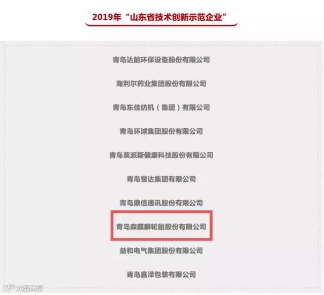 近日,山东省工信厅公示了2019年“山东省技术创新示范企业”,青岛共有10家企业入围名单,青岛森麒麟是其中唯一入选的轮胎企业。也是山东全省唯一一家拟确定2019年“技术创新示范企业”的轮胎企业。