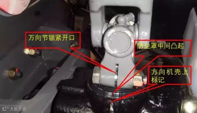 注意:若方向机在零位而方向盘并没有完全回位,表明方向盘不正,在整个调整结束后应再调正方向盘。方向机正确回零的标志是方向机输出轴和方向机外壳上的刻度标志对齐,外壳上的标志是三个凸起的中间那个。
