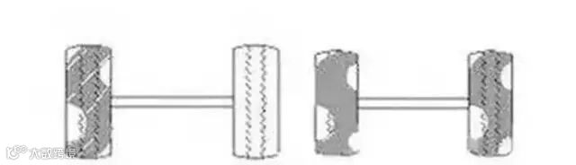 吃胎现象:同轴上的两个轮胎,内边不正常磨损。