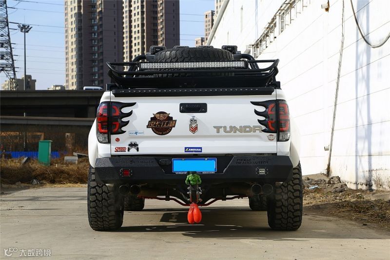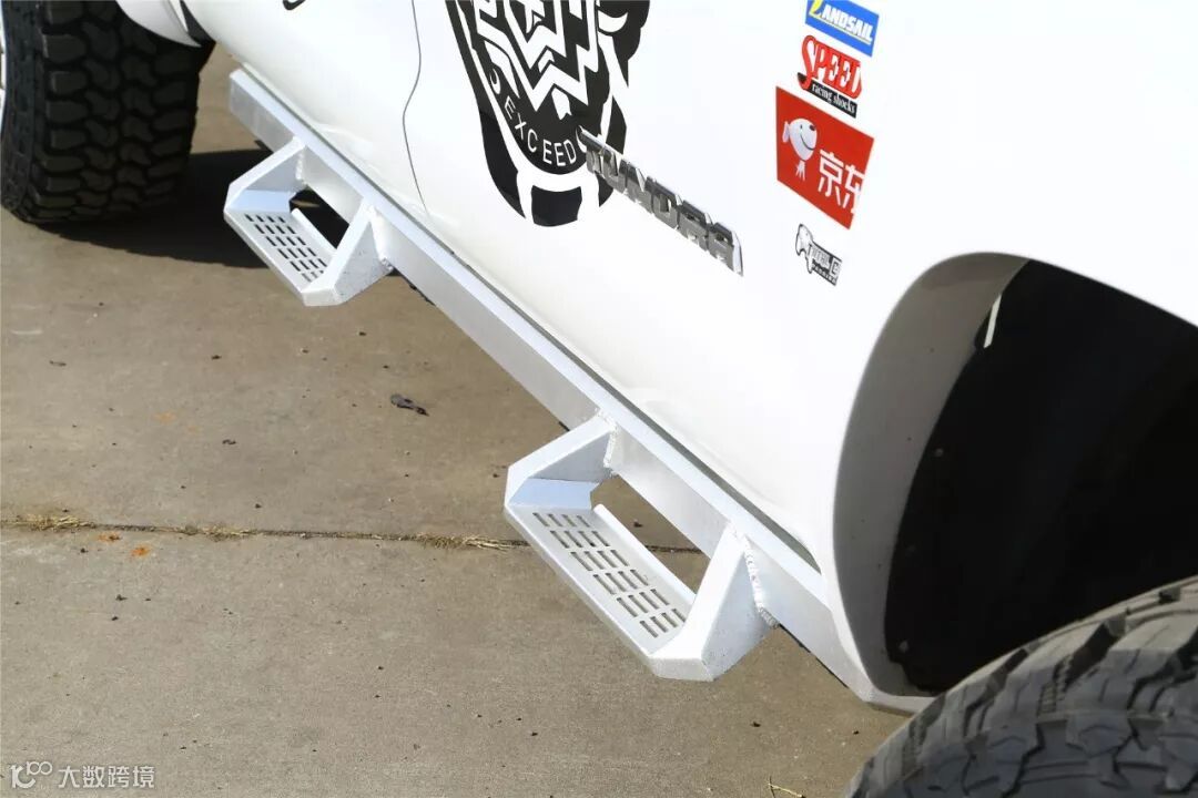 丰田坦途极地版宽体套件,原厂叶子板无损安装,宽体材质采用进口拉丝棉,5层树脂铺垫,硬度超过原厂材质。很显然,宽体加身之后原有的前保险杠就完全不能满足它自身的需求了。