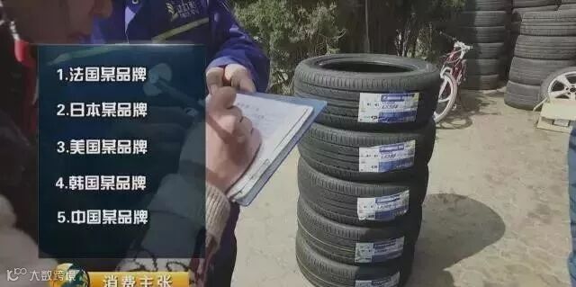 《消费主张》记者在青岛随机购买了5款同一种规格的轮胎:价格最贵的、600多元的法国某品牌轮胎、价格第二的日本某品牌轮胎、价格第三的美国某品牌轮胎、价格第四的韩国某品牌轮胎以及价格最低的中国某品牌轮胎。