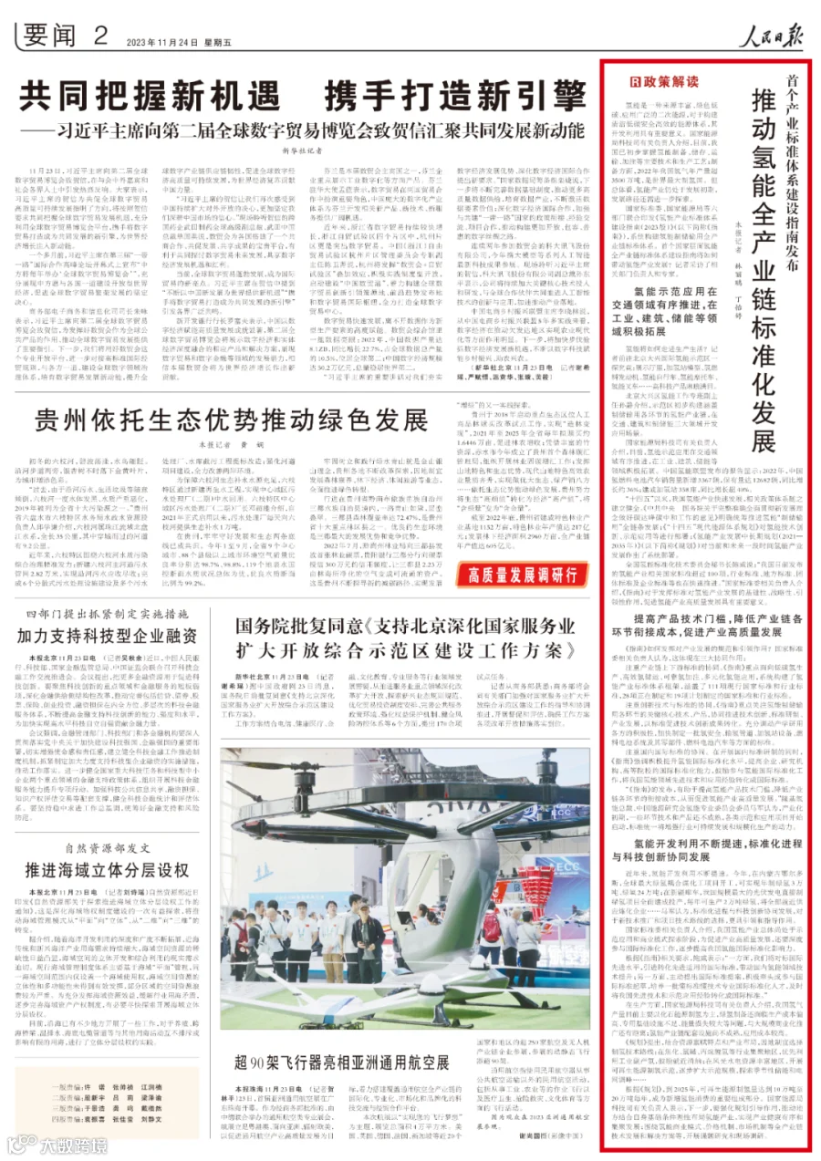 全国氢能标准化技术委员会秘书长鲍威说:“我国目前发布的氢能产业相关国家标准超过100项,行业标准、地方标准、团体标准及企业标准等也在快速推进。”国家标准委相关负责人介绍,《指南》对于发挥标准对氢能产业发展的基础性、战略性、引领性作用,促进氢能产业高质量发展具有重要意义。
