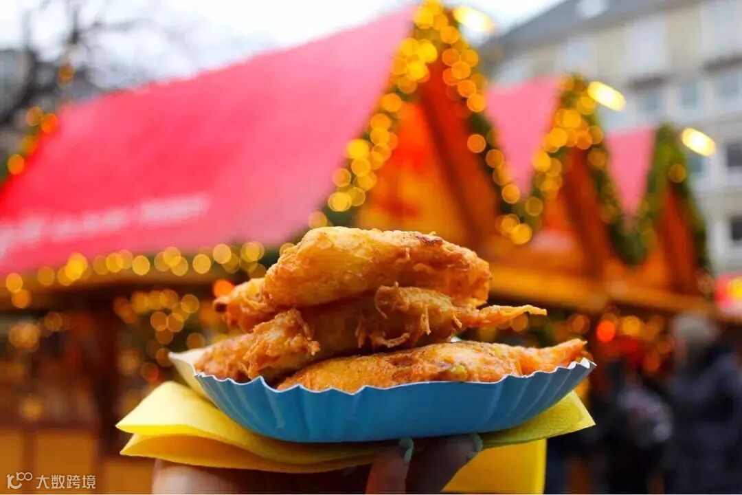 圣诞集市怎能没有土豆煎饼(Reibekuchen)!有时候也叫Kartoffelpuffer。不管它叫什么名字,它都在一个盘子里,一直那么美味!最好再来点儿苹果酱!行家们一般还会配上一杯甜热的Glühwein,才算是真正的德国风情。