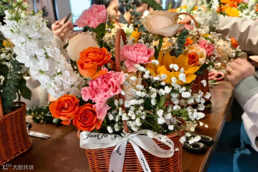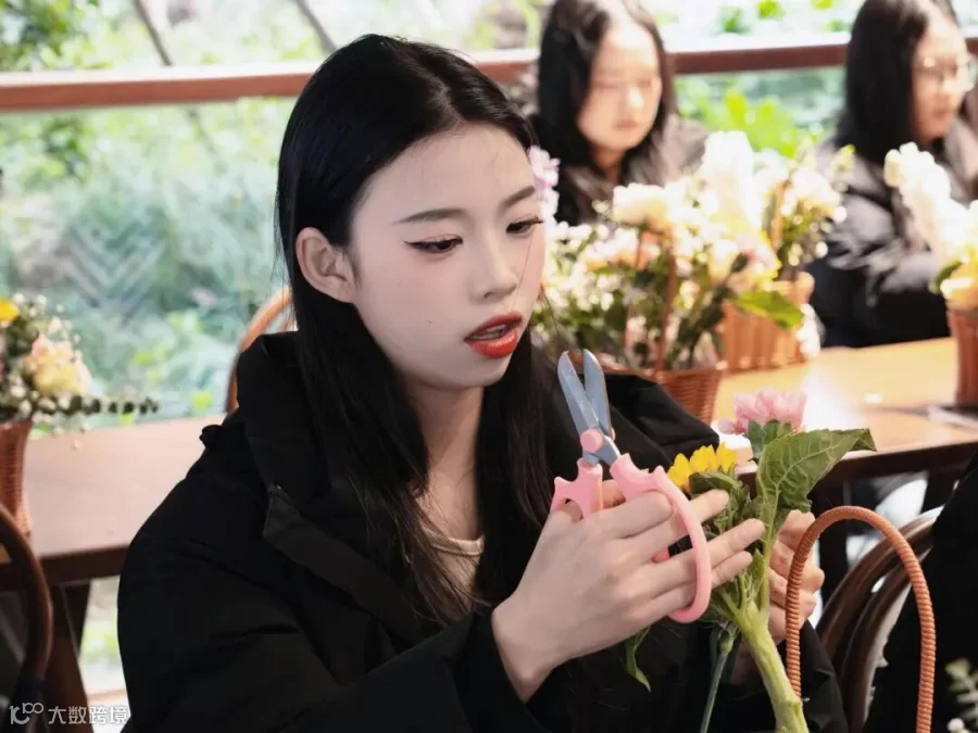 向日葵明媚,玫瑰热烈,康乃馨温柔,尤加利叶清雅……各色花材高低错落,交织成一室芬芳。在花艺老师的指导下,她们指尖起舞,用心挑选、修剪、搭配,将春日的浪漫定格于篮中。