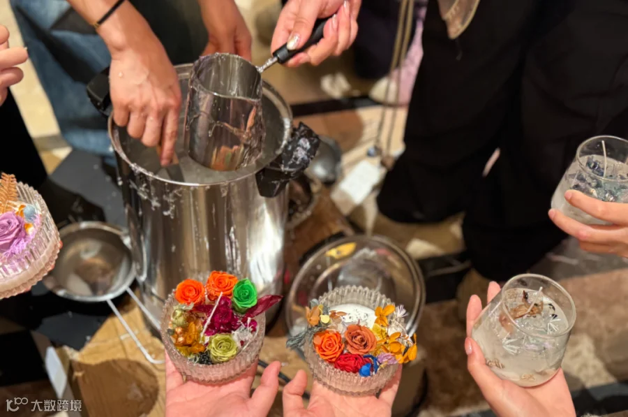 大家被分为“浪漫组”和“惊喜组”,分别体验不同的手作乐趣。浪漫组制作香薰蜡烛。融化豆蜡、调配精油、点缀干花……每一个步骤都需要静心完成。当烛光在成品中轻轻摇曳,淡雅的香气弥漫开来,工作中的疲惫仿佛也被温柔抚平。