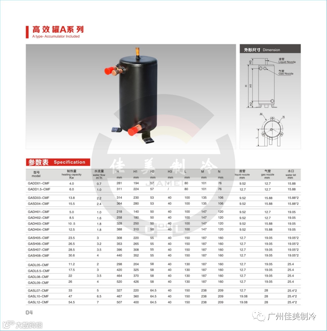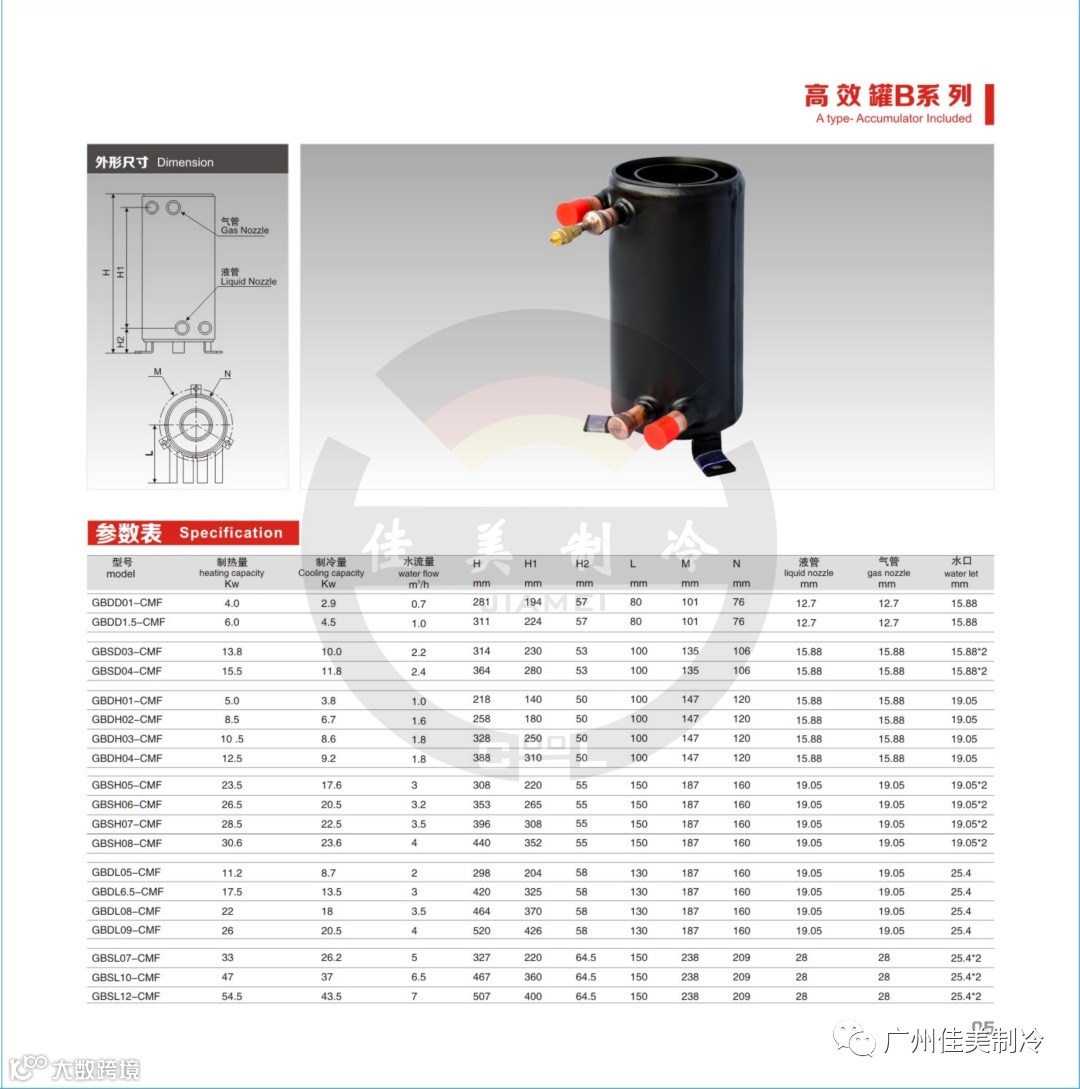 ◎ 铜管内外表面的翅片使制冷剂与冷却水高速紊流,有效提高换热效率。