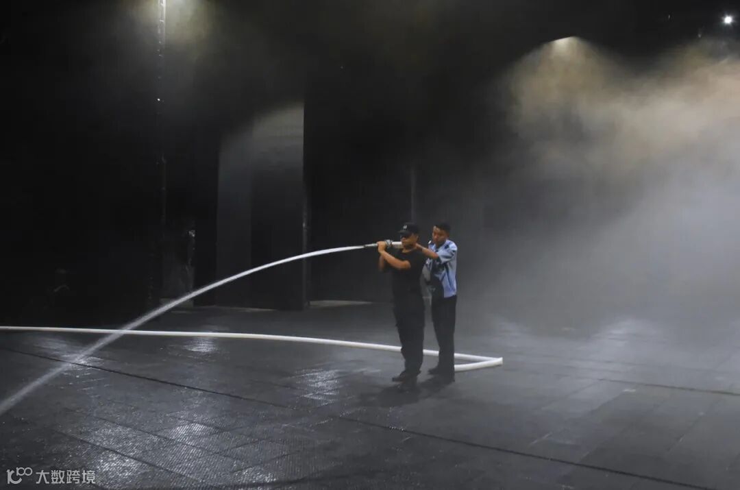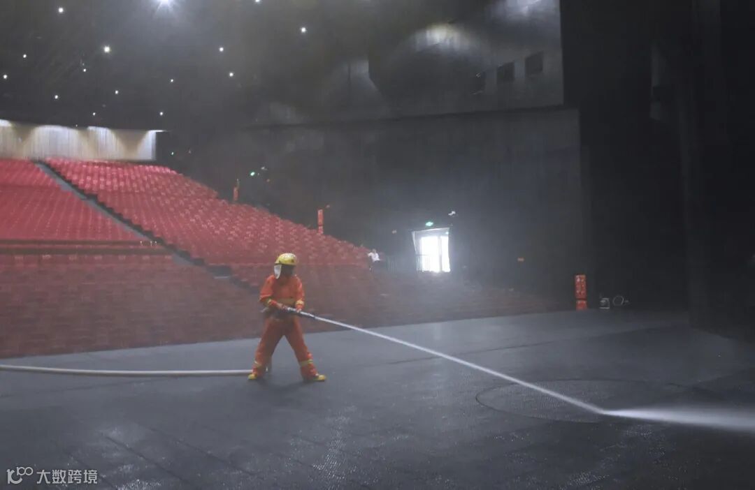 模拟在演出过程中突然起火。安全部剧院值班人员立即拉响警报,找到火源并启动应急预案,消防班迅速出警进行灭火。