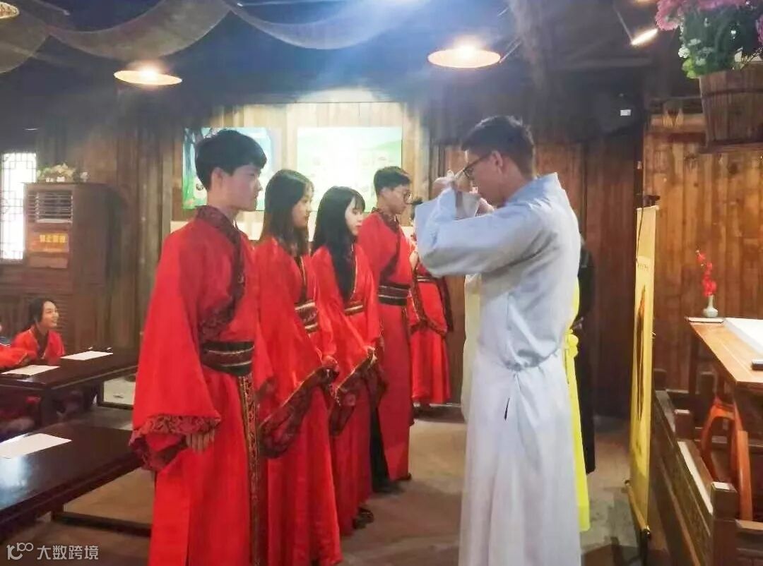 典礼在庄严典雅的氛围中开始,一拜孔子,聆听先贤训导,继承尊师重道的传统文化,永不停止学习的步伐;二拜老师,以茶敬师,感谢老师的谆谆教导,杯子里盛满的不只是茶水,还是学生对老师的深深敬意;三行释菜礼,赠六礼束脩,表示对老师无私教导的感谢,师父也为学生们准备了T恤和书签作为礼物,意为外正衣冠、内勤学习,对学生进行勉励。最后全体吟诵弟子规,以古为训、以史为鉴,愿在座学生前途似锦。