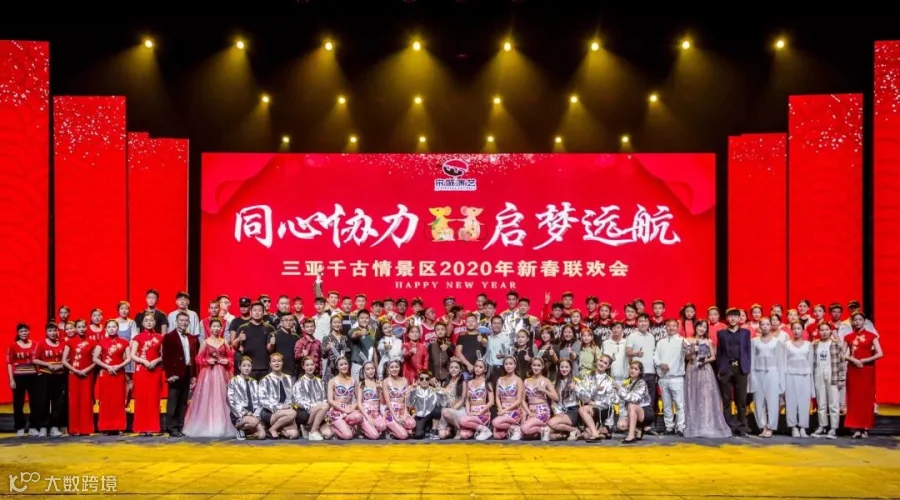 1月10日,三亚千古情景区以“同心协力,启梦远航”为主题的2020迎新年会,在三亚千古情景区2号剧院举行,三亚千古情景区负责人郑杰君、总经理助理王文彪等公司管理人员、全体员工及家属、店铺代表共计600余人参加。新年初始,迎着激昂的乐曲,携手家眷欢聚一堂。