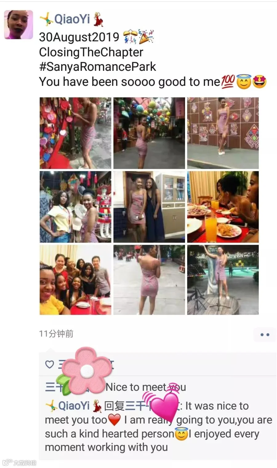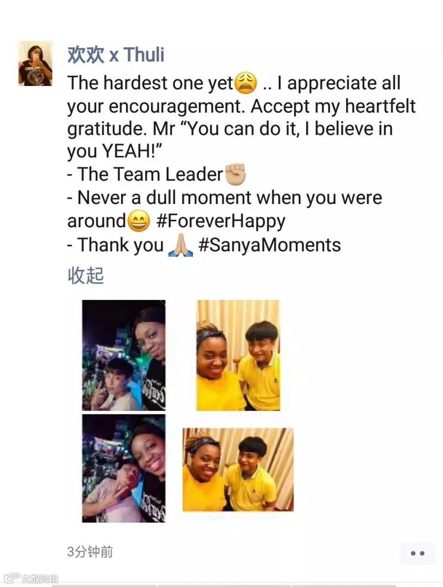 刚踏上异国他乡的土地,我的心情是十分忐忑的,这里和我的家乡有着不同的文化和生活习惯,但是经过两个月后我十分享受这里的生活,领导对我的指点与教导,伙伴们的关心与合作,这些点点滴滴像阳光一样驱散我的不安。——宋城景区 演出活动部 杨思纯