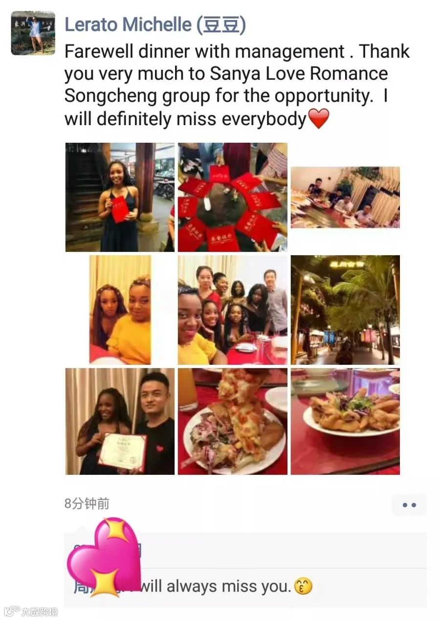 云天收夏色,木叶动秋声。在夏末秋初的时节,来自南非的26位实习生结束了他们在宋城集团为期2个月的实习生涯。同学们在宋城景区、杭州乐园、三亚千古情景区的演出活动部、接待部、综合部、游乐部、商管部等部门实习。为庆祝实习的圆满完成,西湖片区联合湘湖片区在8月28日、三亚千古情景区在8月30日分别举办了别出心裁的实习生欢送会。三亚千古情景区负责人郑杰君、西湖片区人力资源部负责人郝夏阳等分别参加了欢送会。