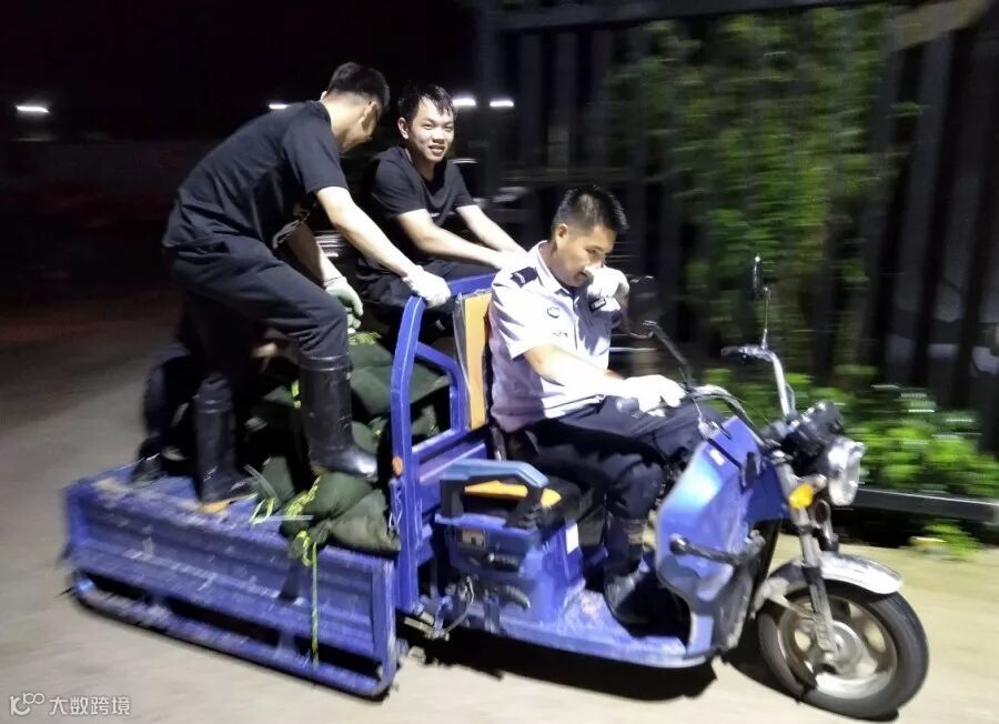 将装好的沙袋运输至景区各个角落,筑牢防洪设施
