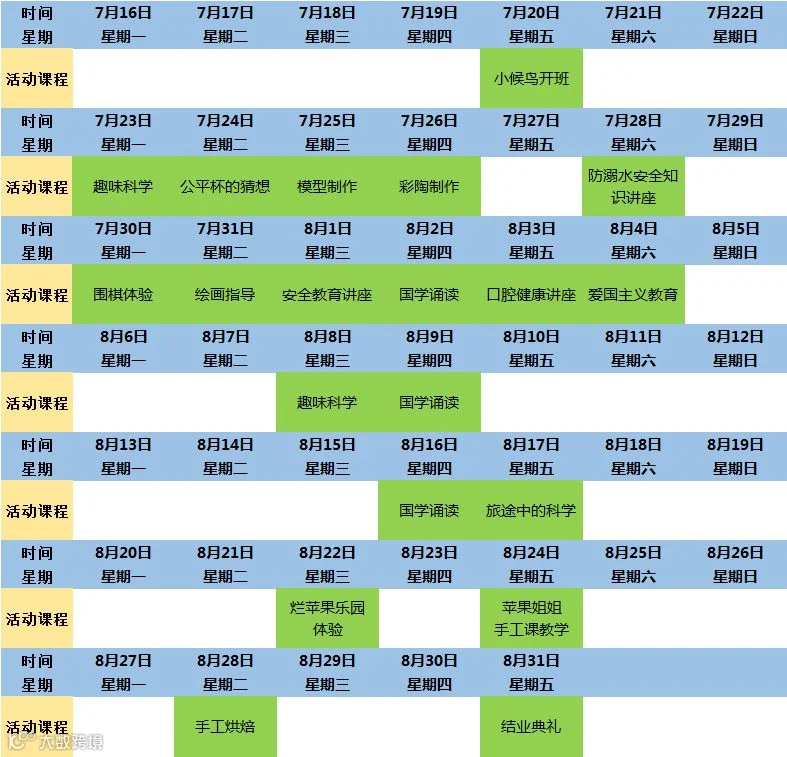 此次暑期“小候鸟”假日学校计划开办至8月31日,休博园社区专门聘请了幼师专业的大学生作为指导老师,除日常辅导暑假作业之余,通过预约青少年宫、“五老讲师团”、科协和社区内社团组织等。假日学校将为“小候鸟”们开展丰富多彩的兴趣课程,其中有手工课程、爱国教育、国学讲座、绘画、安全急救常识、日常口腔健康讲座、趣味科学、模型制作、彩陶制作、围棋体验等等。