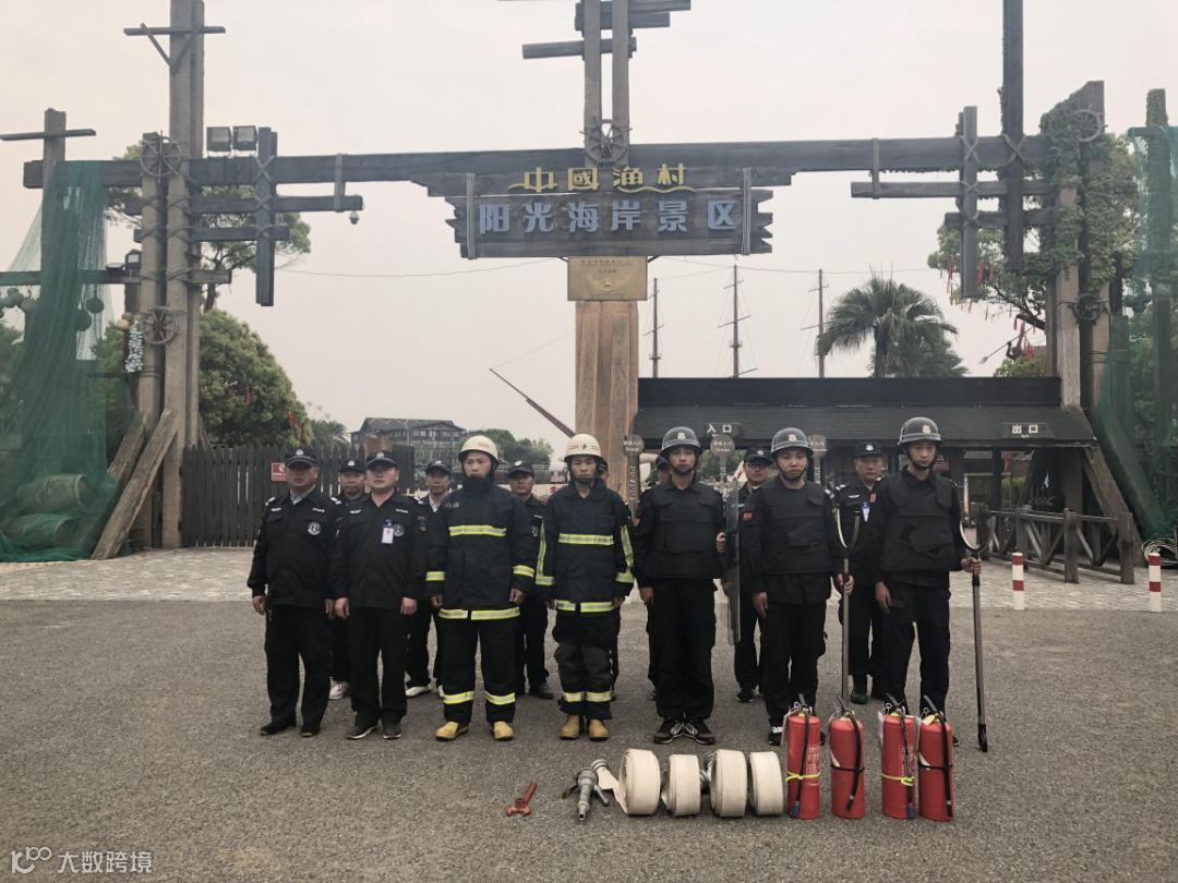 中国渔村模拟停车场车辆自燃情况开展了消防救援、应急疏散演练,同时针对沙滩区域安排涉水盯防。