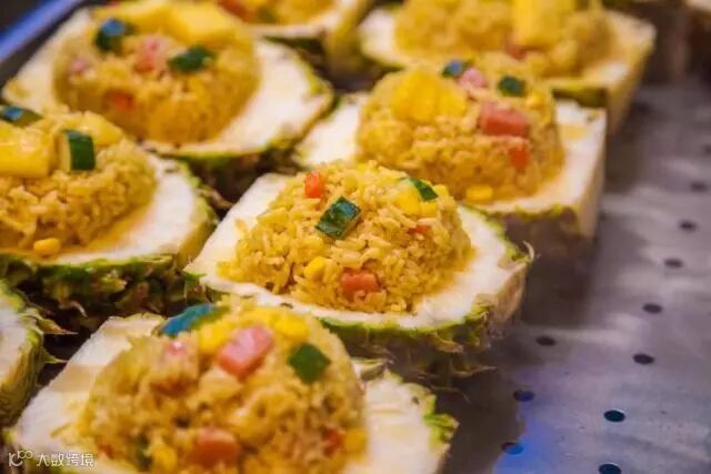 海南菠萝饭是海南常见的美食之一,把整只带皮的菠萝对半切开,取其中的一半做成菠萝碗,用小刀和勺子把果肉挖出来。将挖出来的菠萝果肉切成1cm的小丁倒入翻炒好的米饭中再次翻炒。菠萝味渗入米饭中,菠萝酸甜的滋味在嘴里绽放,炒饭不再那么油腻,多了一份清新。
