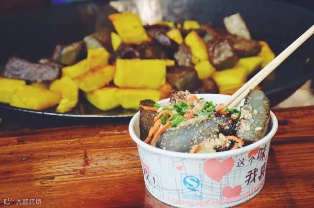 鸡豆凉粉是一道美味的街边小吃,凉拌、油炸,冷热均能感受不一样的美味。凉吃大多在暑季,粉片与红辣椒、绿韭、花椒、青葱、芥沫、酸醋等腌拌在一起,粉片的嫩滑配以辣椒的火热,夏天~就是这个味儿。热吃多在寒凉季节,粉块在平底锅两面煎黄,按各人味口加上麻、辣、酸的各种佐料,一碗下肚,全身温暖。
