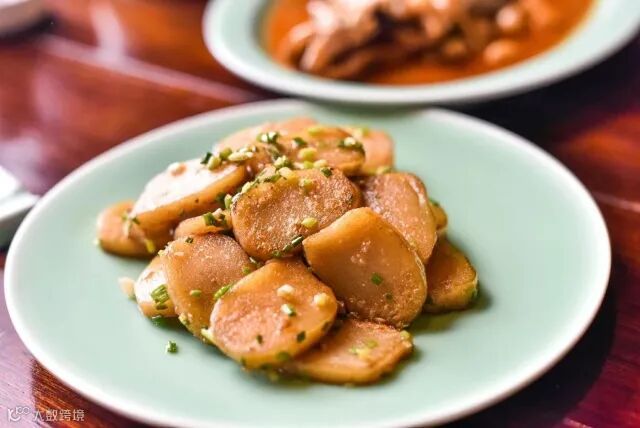 黄果切片,用微火煎至两面金黄,放入生抽、料酒、葱花翻炒均匀即可 。黄里透绿,色泽晶莹、清香柔韧,十分可口,营养丰富,既可当主食也可当菜。