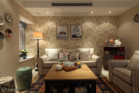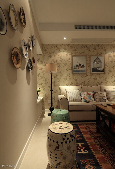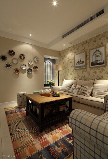 民族风的地毯很抢眼,和纯色米色布艺沙发对比强烈,缓解视觉疲劳。