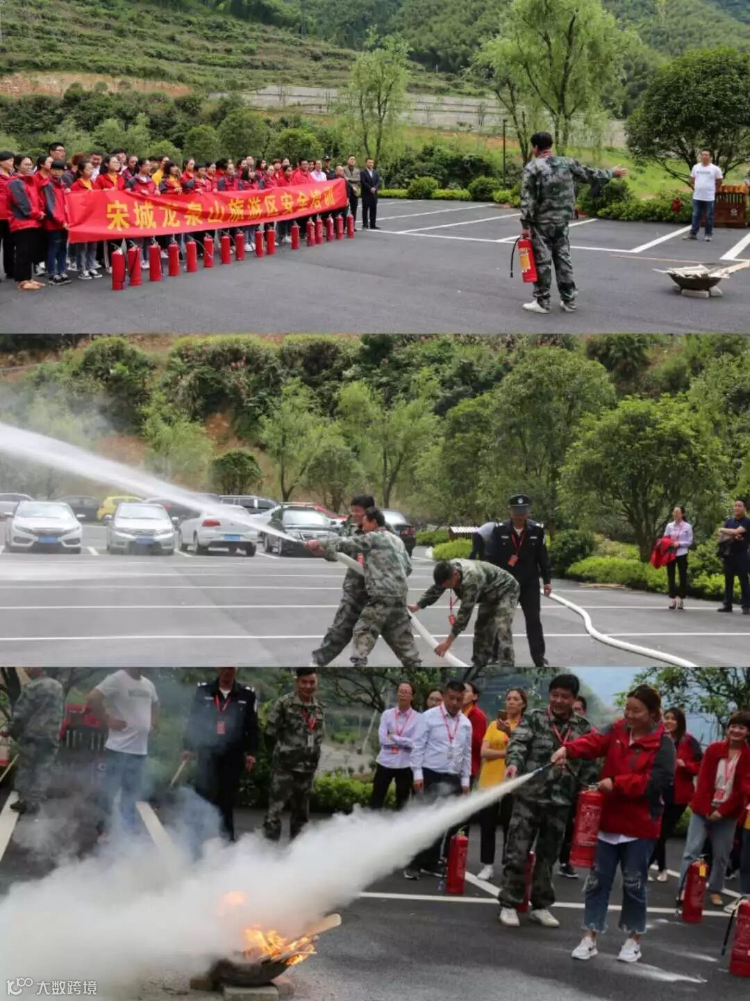 龙泉山景区保安队长向员工普及消防常识,讲解并演示消防灭火注意事项及实际操作演练。