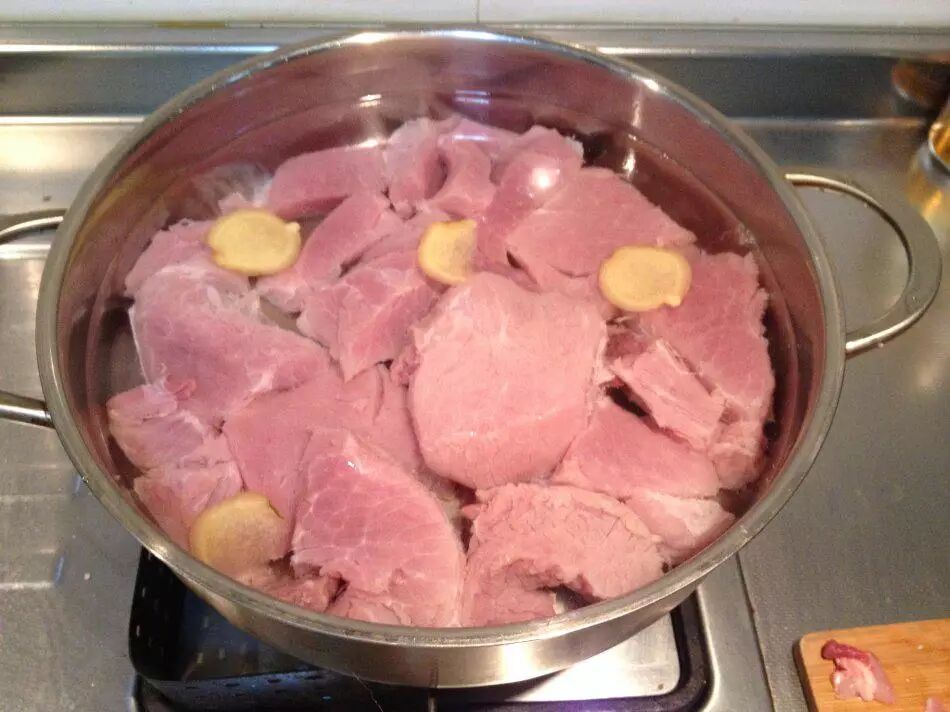 加料酒、姜片,冷水下锅焯水。肉类焯水一定要冷水下锅,否则内部的血水出不来。