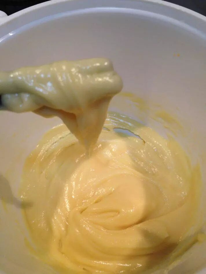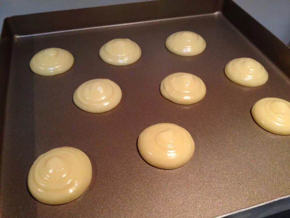 后面的步骤就和网上一样了,待凉后分次加入蛋液,至面糊在筷子头形成倒三角而不滴落的状态,装入裱花袋,挤在烤盘上。