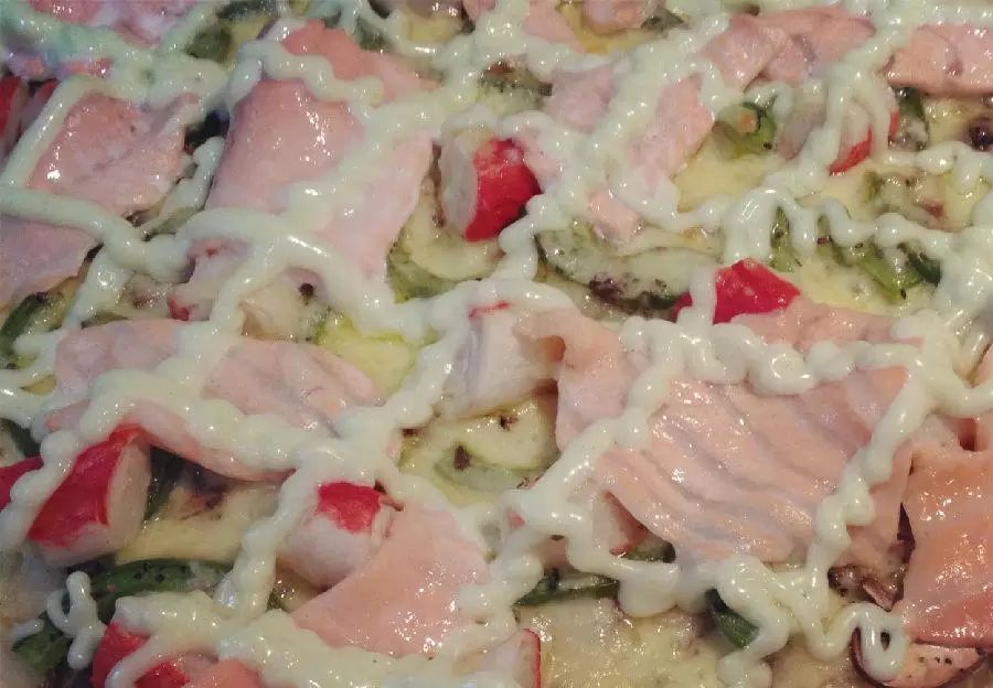 我最喜欢的披萨是多年前必胜客的大西洋珍鲑披萨,自己做也非常简单,披萨饼的具体做法就不赘述了,和面包差不多,就是擀成薄饼状。我就说一下这个披萨的配料,三文鱼+(蟹肉棒、虾仁、鱿鱼条等海鲜自行选择)+青椒+蘑菇+马苏里拉芝士,三文鱼与番茄酱不搭,所以这个披萨不放常规的番茄酱,而是自制一种与三文鱼绝配的酱料(山葵酱或芥末酱+色拉酱,比例约是1:10)。三文鱼待整个披萨烤熟后再平铺在上面,回炉1分钟,出炉挤上特制酱料。