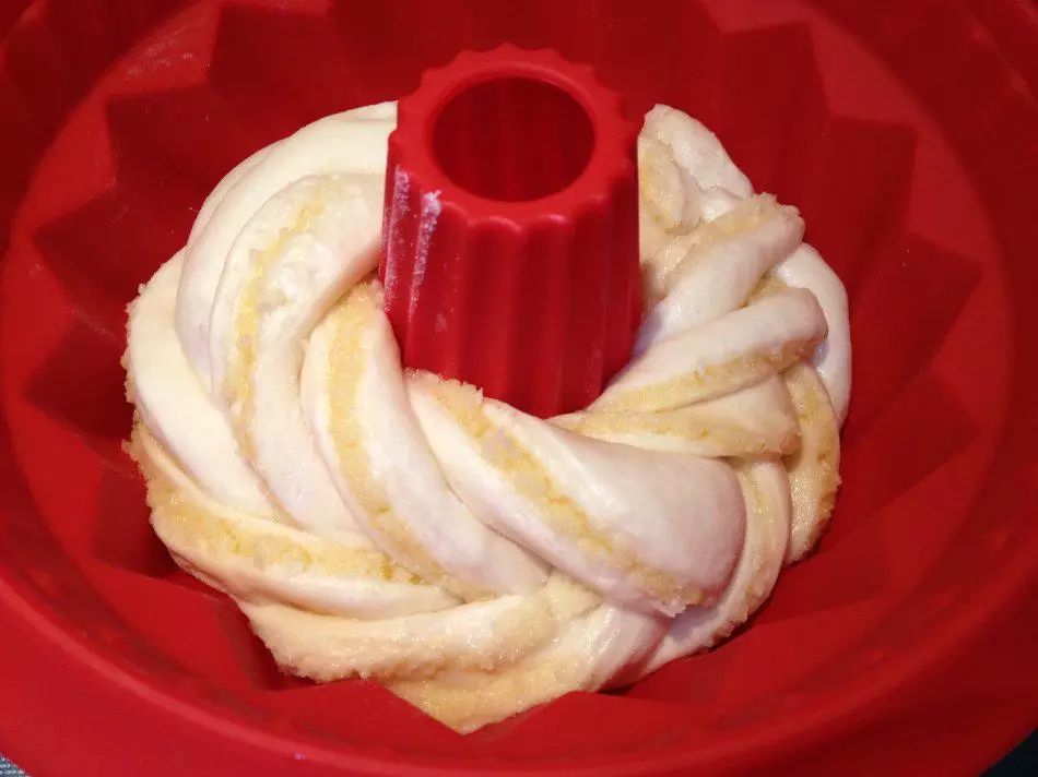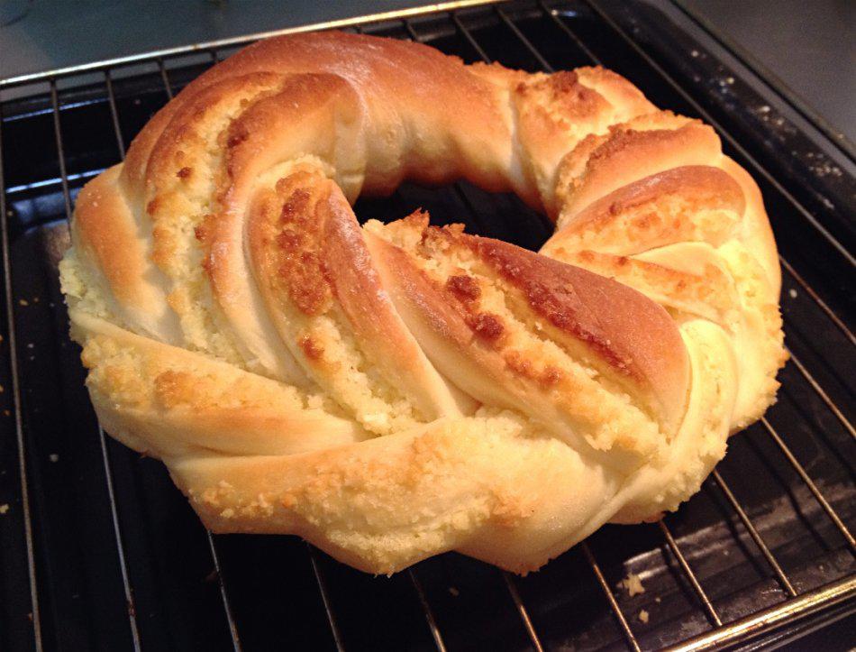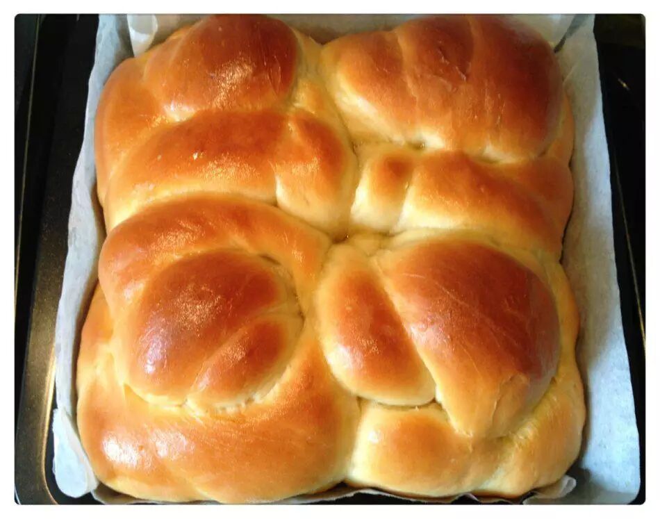 6、将相接的部分塞进圆圈里,表面是5个辫,排到涂过油的烤盘上,放温暖湿润处进行最后发酵。