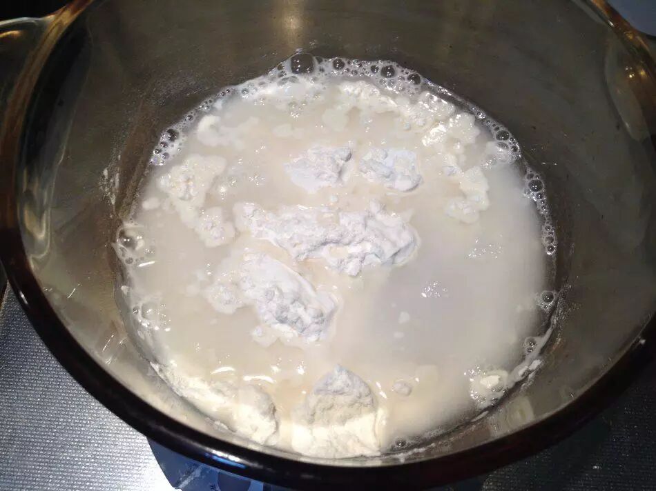 1、将酵头中的原料混匀,放温暖处发至膨胀后回落,内部呈蜂窝状。发酵时将面盆放在发酵箱里,这个过程约2小时。各家条件不同,时间仅供参考,还是要看程度。